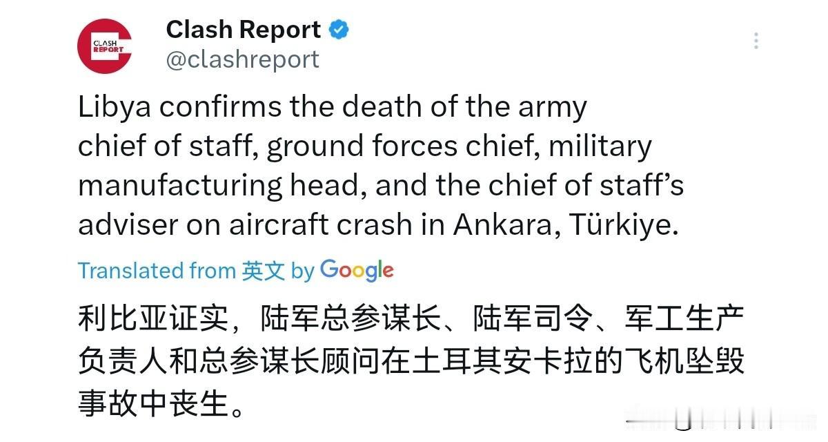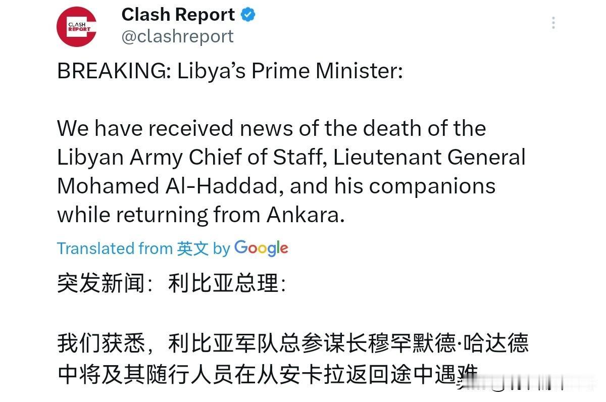 出大事了!12月24日,土耳其内政部刊发紧急通报,利比亚总参谋长哈达德将军搭载的飞机在土耳其境内坠毁,多名高级军方陪同人员均遇难。外媒表示,一架尾号为9H-DFJ的猎鹰50型公务机于今日晚间8时10分从安卡拉埃森博阿机场起飞,飞往利比亚首都黎波里,于晚间8时52分失联。 该飞机在海曼纳地区附近发出紧急迫降警报,不过此后相关方面多次尝试与飞机重建联系,均未成功。初步消息显示该飞机起飞后不久便发生电气故障。机组人员随即发出紧急求救信号,并开始返航,飞机在准备紧急迫降的过程中启动了燃油抛洒程序,但在燃油抛洒阶段发生爆炸。土耳其当局已证实该飞机坠毁,安全部队现已抵达坠机残骸现场。 该飞机上搭载5名乘客,其中包括利比亚总参谋长穆罕默德·阿里·艾哈迈德·哈达德将军。相关信息显示,12月23日,利比亚方面是应土耳其总参谋长塞尔丘克·巴伊的邀请,赴安卡拉开展军事外交活动 。到目前为止,利比亚方面证实,包括陆军参谋长、地面部队司令、军工生产负责人以及参谋长顾问均在土耳其安卡拉的此次坠机事件中遇难。这样的事故,对于利比亚军方乃至国家都是巨大的损失。