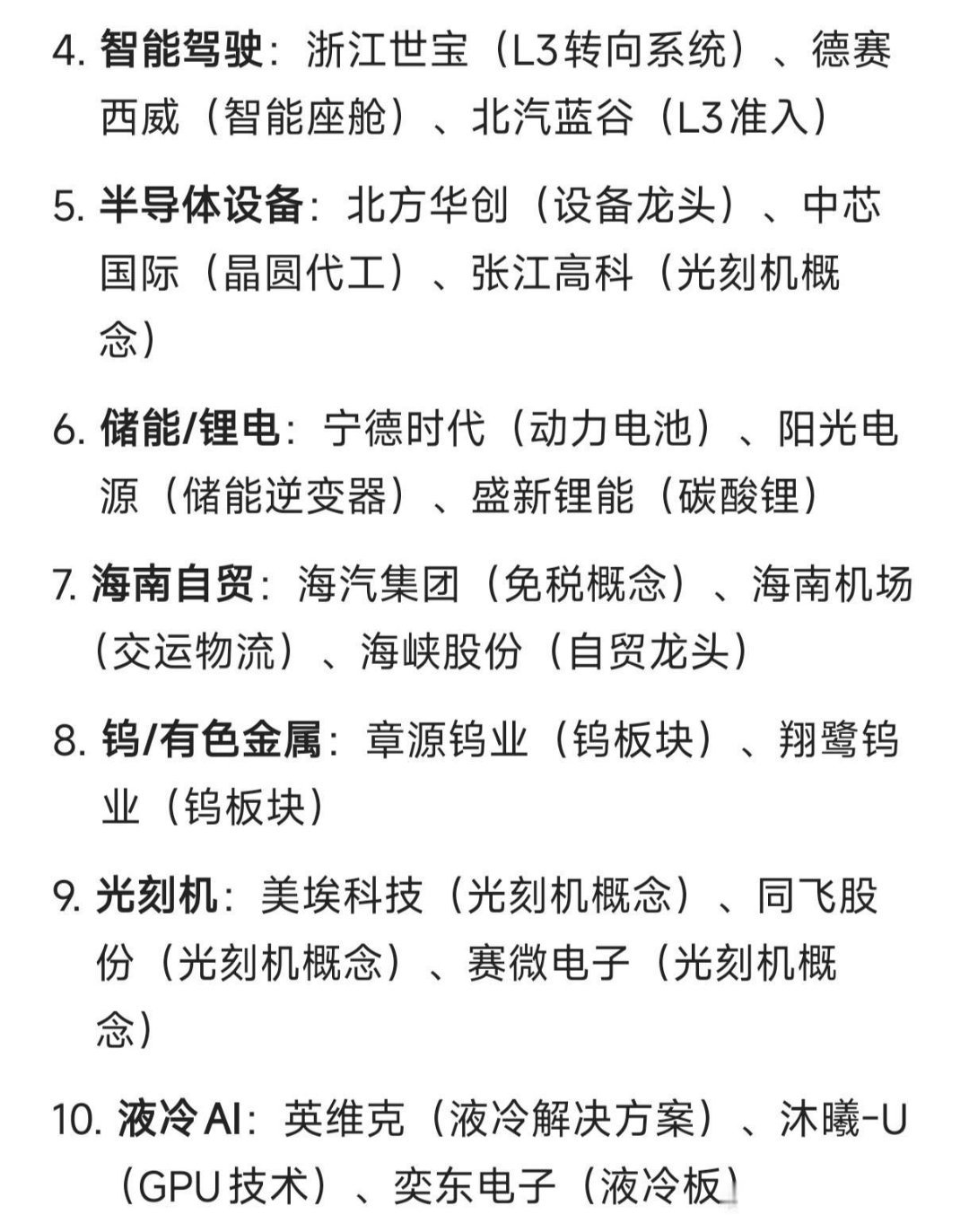 12月23日十大热点概念及产业链龙头梳理:商业航天:航天电子(航天测控)、航天发展(低轨星座)、中国卫星(卫星制造)可控核聚变:西部超导(超导材料)、安泰科技(钨偏滤器)、中国西电(特高压电网)AI算力/CPO:中际旭创(CPO光模块)、工业富联(AI服务器)、澜起科技(内存接口芯片)智能驾驶:浙江世宝(L3转向系统)、德赛西威(智能座舱)、北汽蓝谷(L3准入)半导体设备:北方华创(设备龙头)、中芯国际(晶圆代工)、张江高科(光刻机概念)储能/锂电:宁德时代(动力电池)、阳光电源(储能逆变器)、盛新锂能(碳酸锂)海南自贸:海汽集团(免税概念)、海南机场(交运物流)、海峡股份(自贸龙头)钨/有色金属:章源钨业(钨板块)、翔鹭钨业(钨板块)光刻机:美埃科技(光刻机概念)、同飞股份(光刻机概念)、赛微电子(光刻机概念)液冷AI:英维克(液冷解决方案)、沐曦-U(GPU技术)、奕东电子(液冷板)