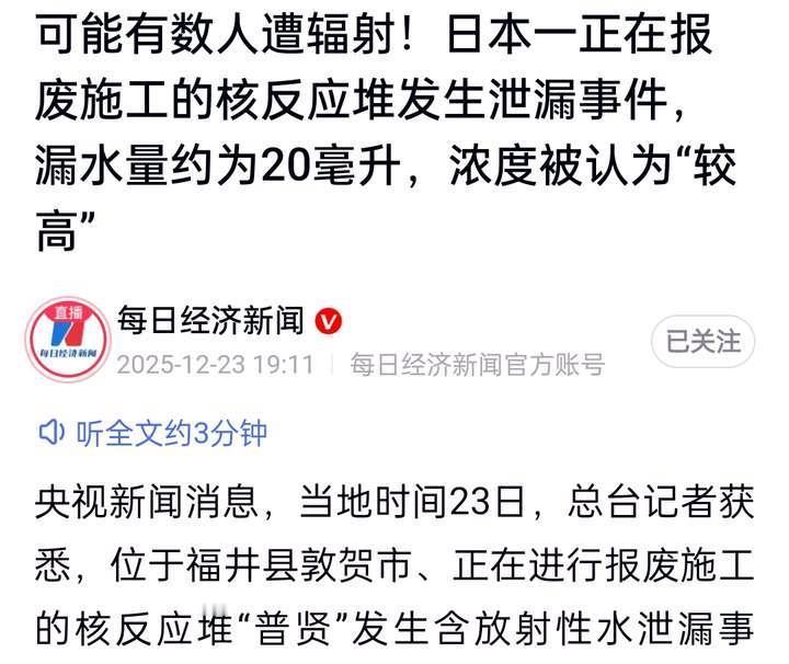 12月24日,据央视新闻直播间报道,位于日本福井县敦贺市,正在进行退役作业的新型转换炉原型反应堆“普贤”今天(12月23日s发生含有放射性物质的水泄露事件,有许多人受到了辐射照射。 据悉,在辅助厂房进行拆解作业时,氚的浓度出现上升,目前尚未确认对外部环境造成影响。 评论,日本是世界上核电站最多的国家,大部分都是在70年代左右建造的,当年的技术水平比现在落后多了, 设备老化达不到设计要求了。 因此,近期日本核泄漏频发,并且将含有放射性物质水排入大海已经是17次了,给人类海洋造成一定的核污染。世界各国应该制裁日本,禁止他们的海产品农产品入境。