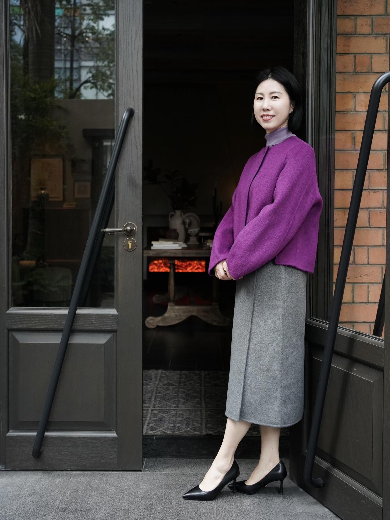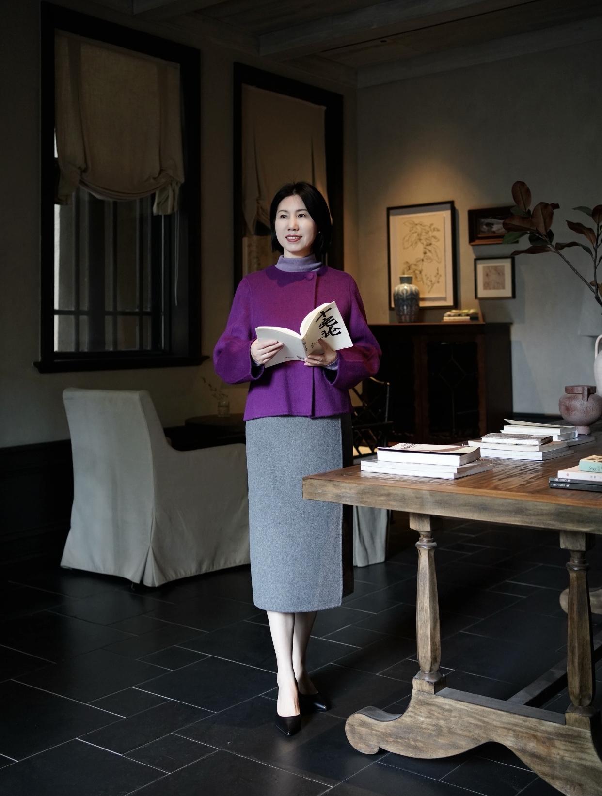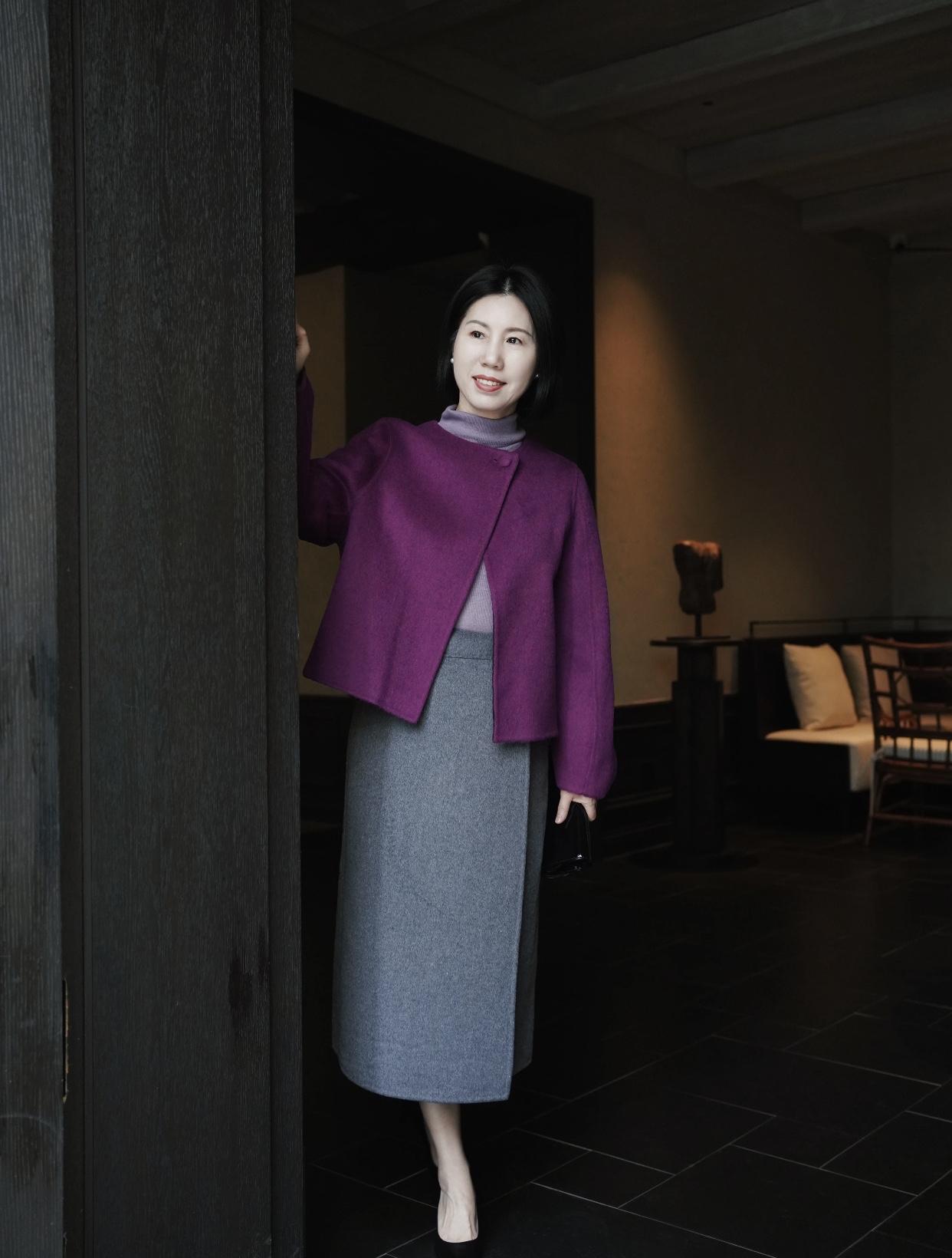 优雅紫色毛衣,搭配灰色半身裙,尽显知性魅力!