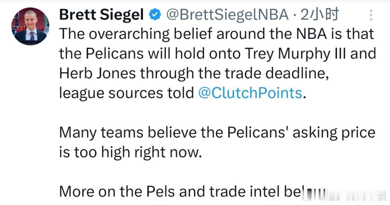 Siegel: NBA圈内的普遍看法是,鹈鹕队将在交易截止日前留住特雷-墨菲三世与赫伯-琼斯。因为多支球队认为,鹈鹕目前为这两人标出的要价过高。