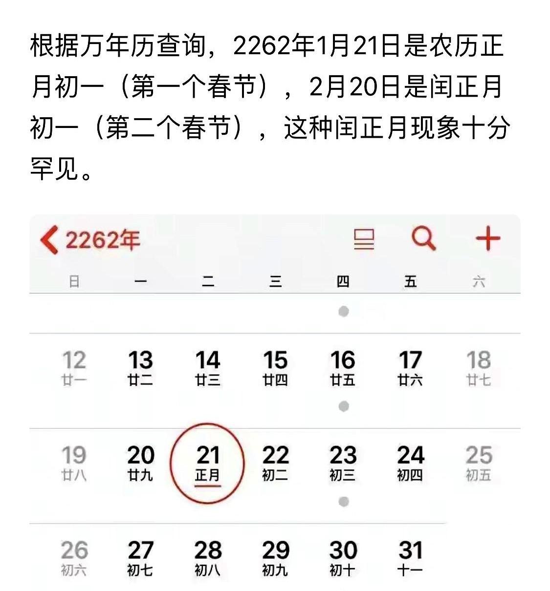 刷到一个话题,说2262年,有两个春节。 我心想,嚯,双倍快乐啊!再一看年份,2