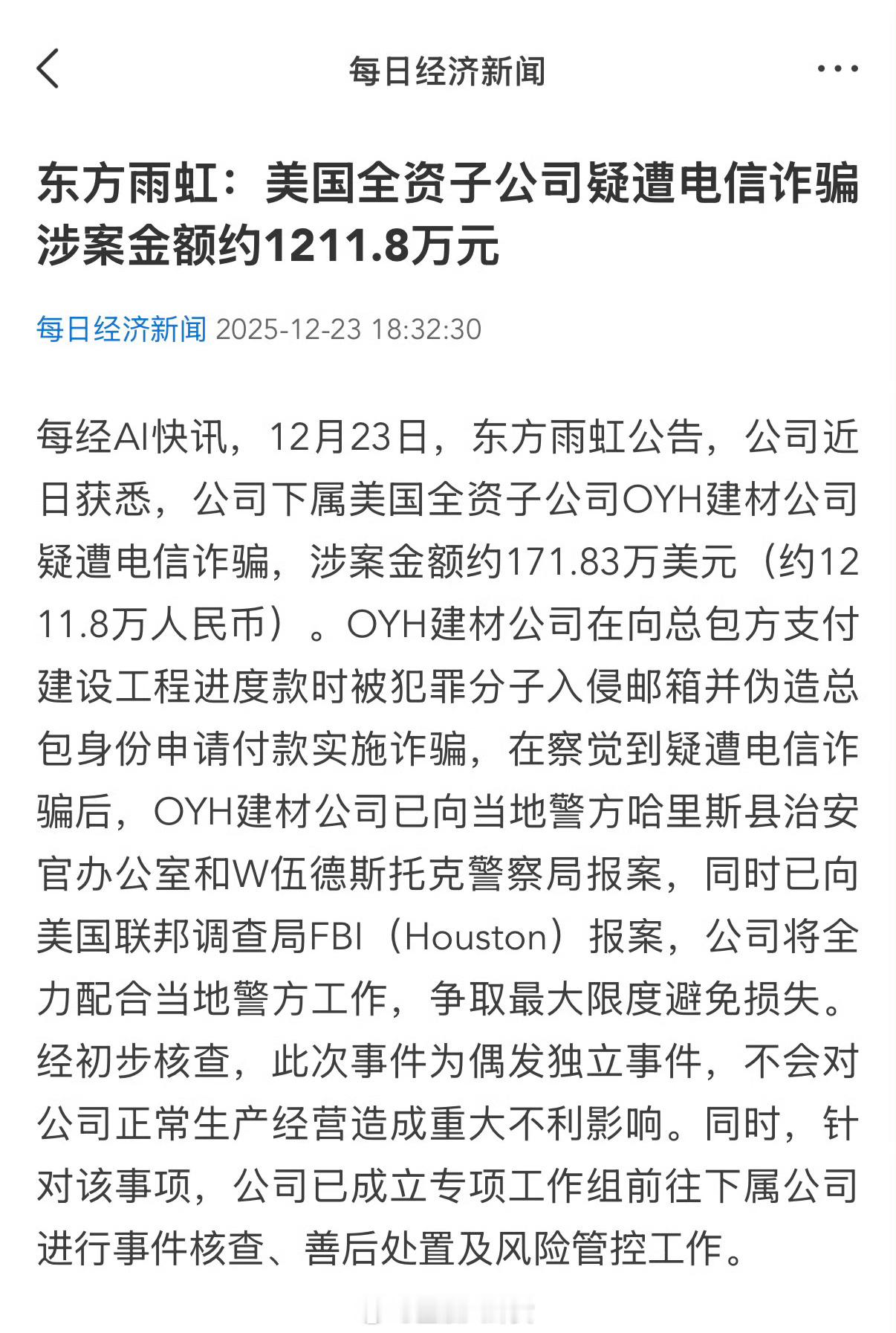 东方雨虹:美国全资子公司疑遭电信诈骗涉案金额约1211.8万元