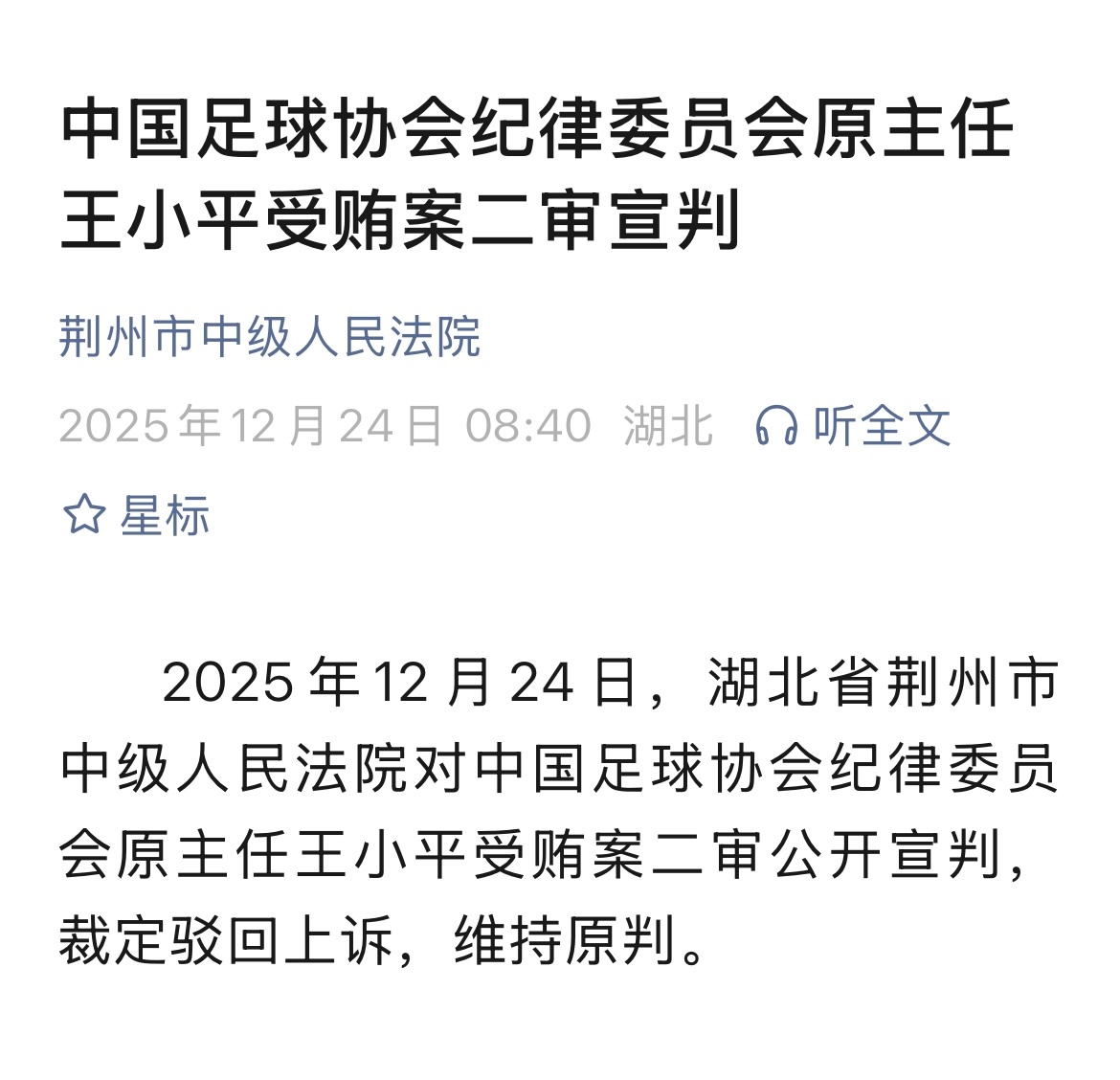 #王小平十年六个月刑期不变# 2025年12月24日,湖北省荆州市中级人民法院对中国足球协会纪律委员会原主任王小平受贿案二审公开宣判,裁定驳回上诉,维持原判。#王小平受贿案二审维持原判#据此前消息,2025年7月30日,湖北省松滋市人民法院公开宣判中国足球协会纪律委员会原主任王小平受贿案,以受贿罪判处被告人王小平有期徒刑十年六个月,并处罚金人民币七十万元;对被告人王小平受贿所得财物及孳息依法予以追缴,上缴国库。松滋市人民法院于2025年4月16日公开开庭审理了该案。