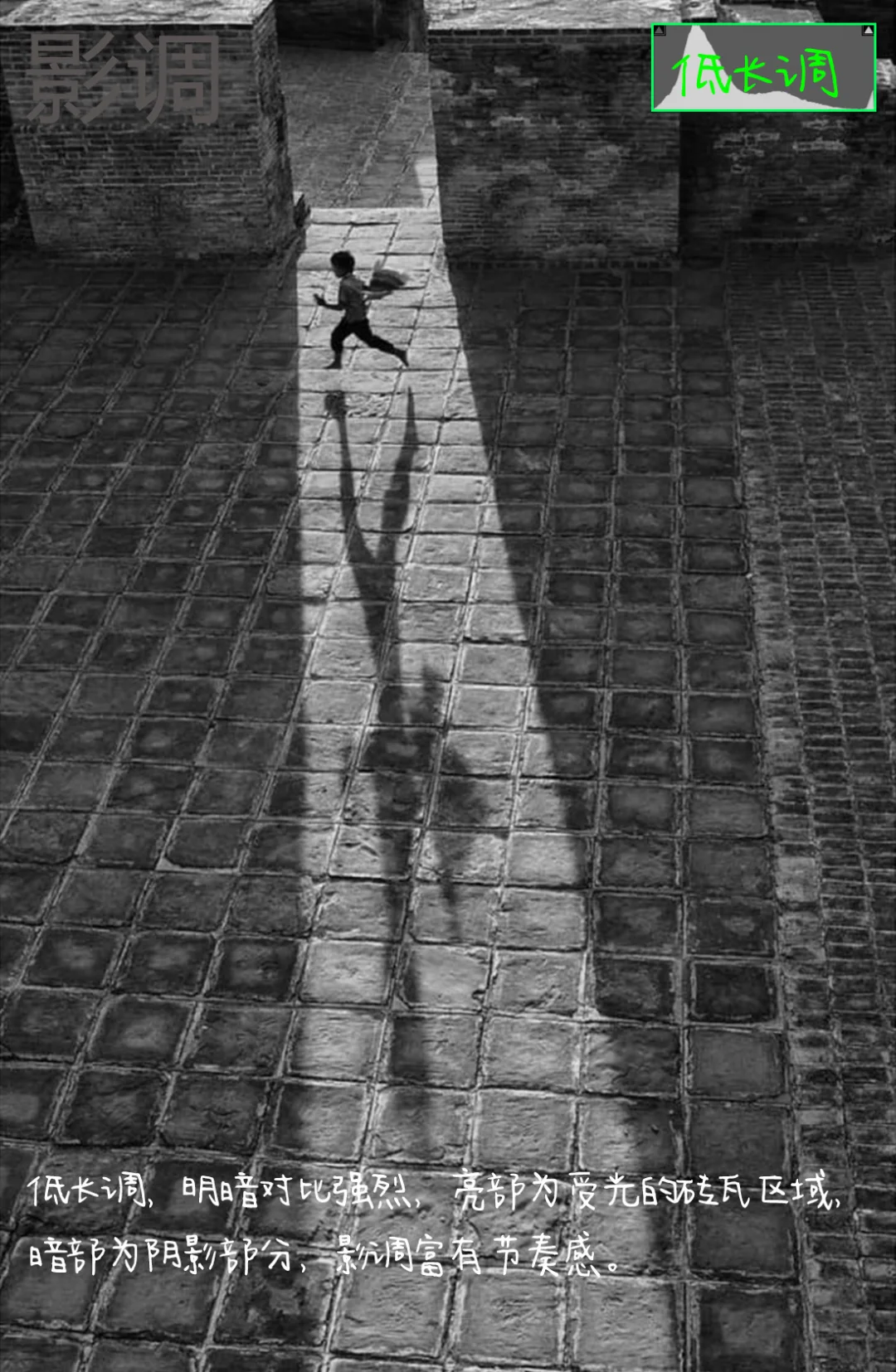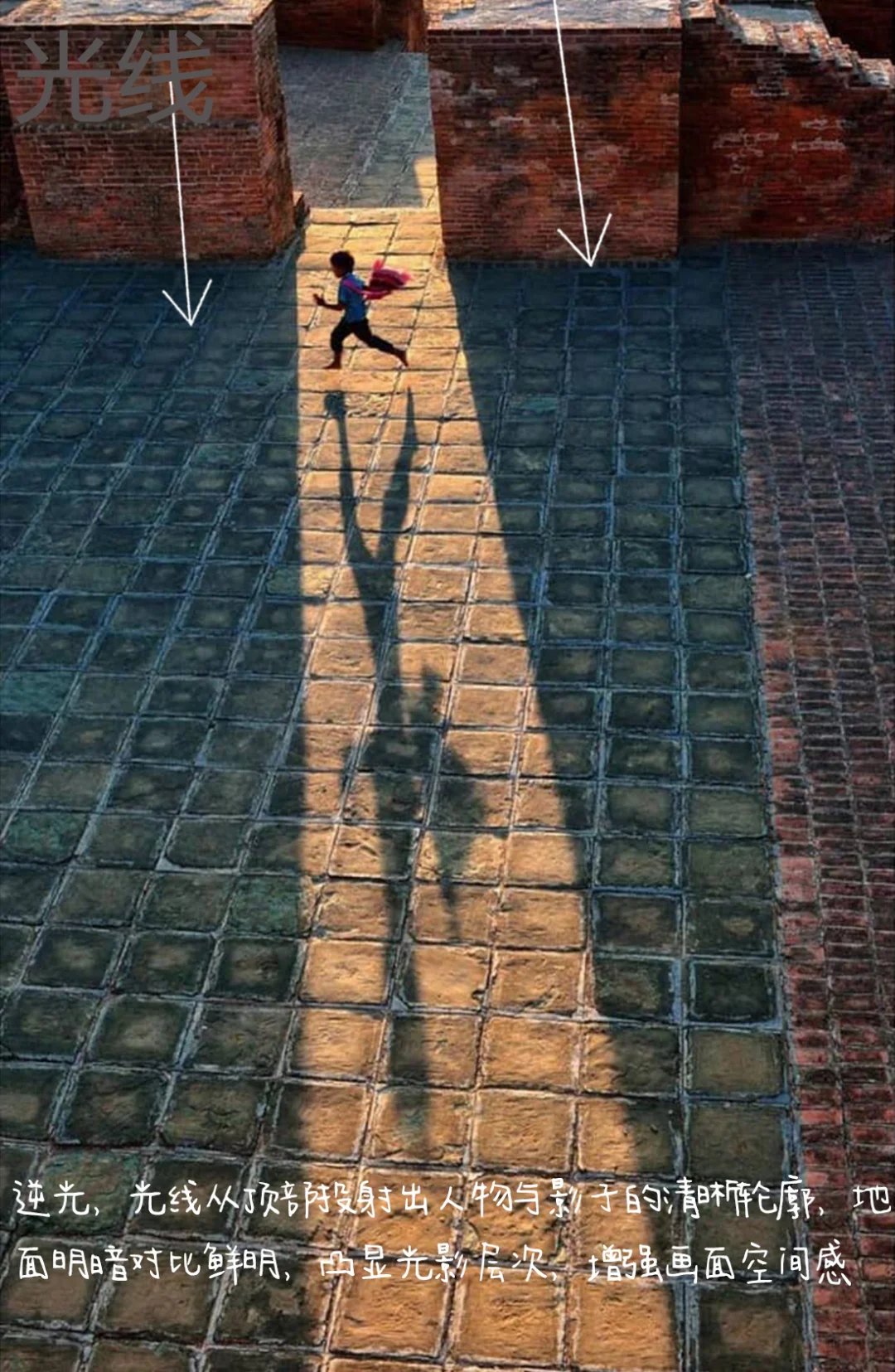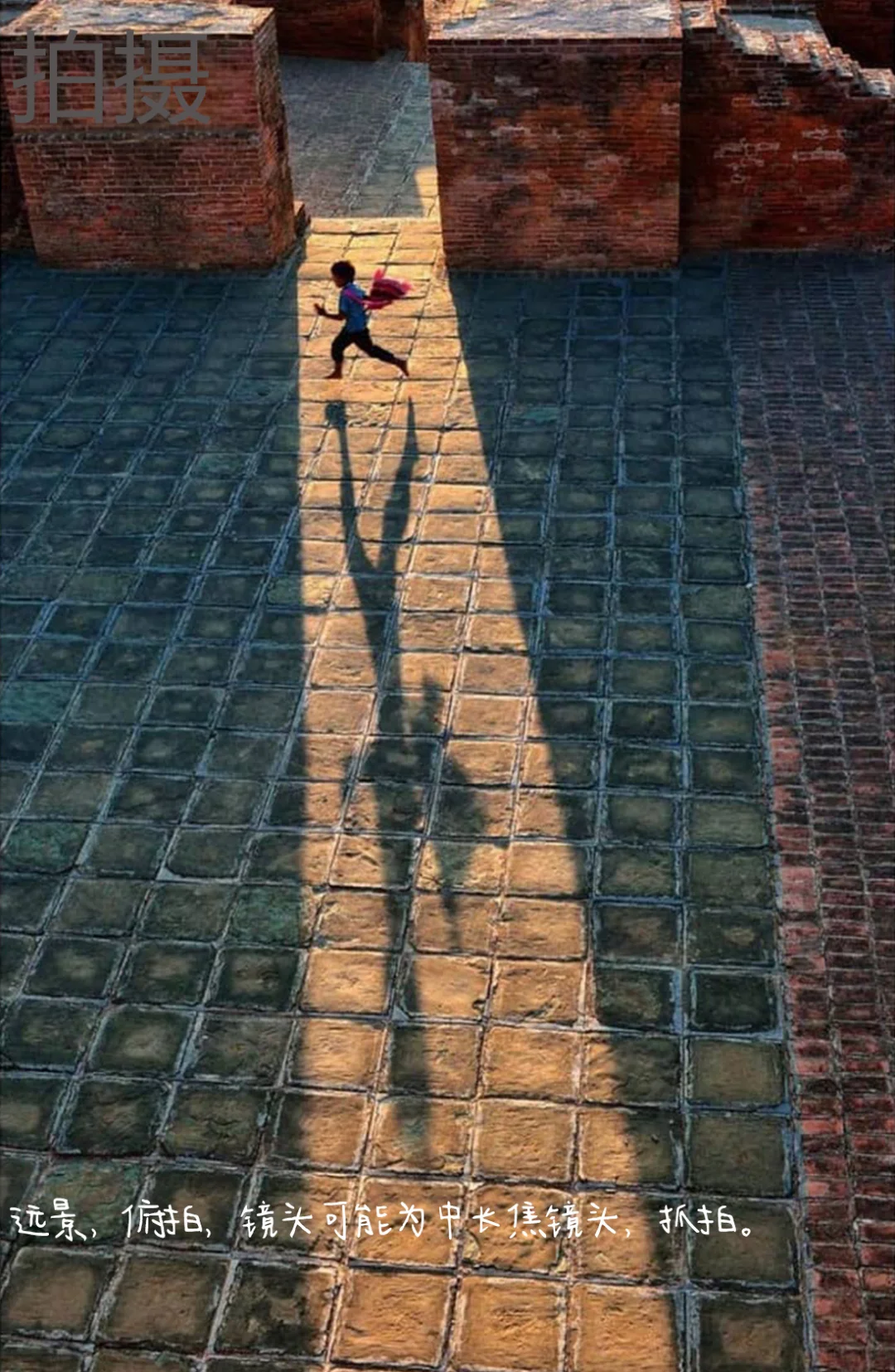 1.构图:引导线构图,画面光影在画面中形成引导线,人物与影子形成视觉焦点,人物动态清晰有张力,砖瓦地面的几何纹理增强画面秩序感,强化画面的张力和生动性。