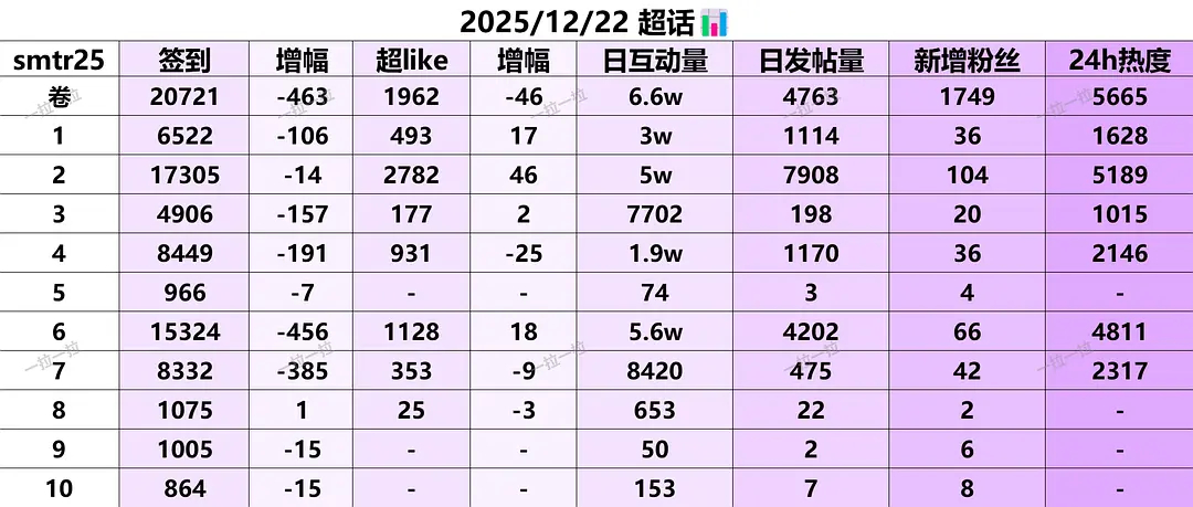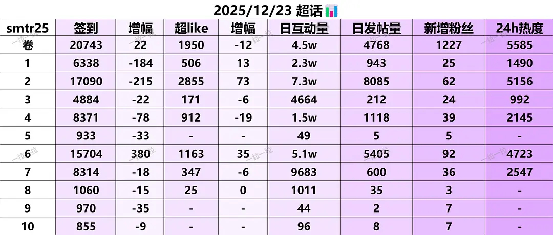 可以直观看到我们超话签到人头数一直保持着第一,超话其他附属数据值却匹配不上签到第一的优势?看得出大家签到完就拍拍屁股走人,发帖数量顺带衔接着热度值和超like人头,我们发帖太少互动太少,导致都不构成正比。为什么要重视超话数据全能六边形?1️⃣数据直接反映粉圈活粉有多少,起到维系粉圈活跃度的工具、作为评估粉丝黏性的参数标准。2️⃣借此重拾粉圈安稳感,集中强大凝聚力,有事做枯水期才有好盼头大动力安稳度过,以最大限制减少死忠体量的损失。3️⃣挑战突破自我与拉练并行,不能停滞不前不向上发展,唯有走好上坡路,相信我们是潜力股完全有魄力能做好这些。4️⃣展现tc中最为真实的人气值,好让出圈知名度能匹配到相应完美的数据值。超话每一项数据值是十分必要做且赋予含金量的,优秀的数据离不开每一位粉丝的努力,所以要每日投入几分钟做超话数据培养自我意识的积极性,敏感度时效性也能得到充分反射式提高,做了只有利没有弊,好好托举李河民才是粉圈心之所向的唯一核心,粉圈干实事出成绩才不容易被消磨,迈出第一步,看到行动才能凸显爱意,爱意永远只增不减。教程图简单易懂,每天打卡必做,一起努力创造好氛围。