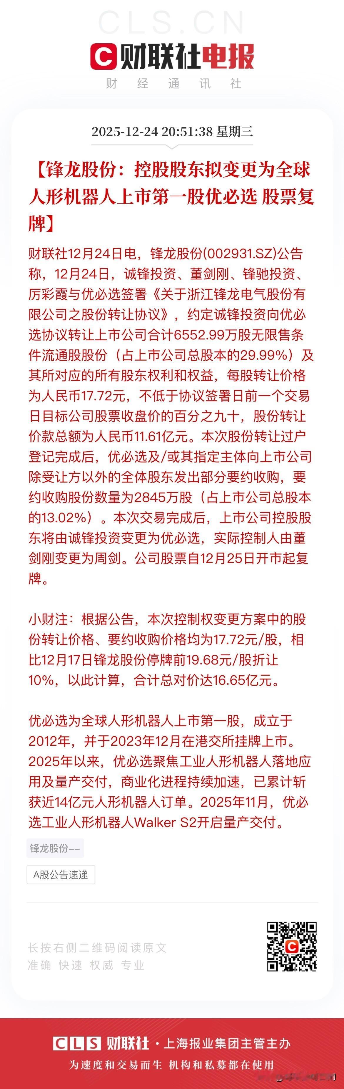 优必选入主锋龙股份,这又得多少个涨停才能开板呢?蹊跷的是,停牌前一天却突然涨停! 12月17日,原本是空头趋势的锋龙股份却突然拉升涨停!没想到晚上还有更大的惊喜,当晚公司发布公告称筹划控制权变更事项停牌! 今晚,锋龙股份再次发布公告并称控股股东将变更为全球人形机器人上市第一股优必选! 这个新闻可以说是惊喜中的惊喜,因为这就意味着锋龙股份在明天复牌后将开启连板模式。 要知道在之前已经有两家人形机器人公司入主A股上市公司了,分别是智元机器人入主上纬新材和七腾机器人入主胜通能源,其后上纬新材17个交易日涨幅高达1320%,最大涨幅将近20倍,而胜通能源目前已经是9连板,完全没有开板的迹象! 在这里就提前恭喜胜通能源的股民了,你们从明天开始就可以每天数板了!