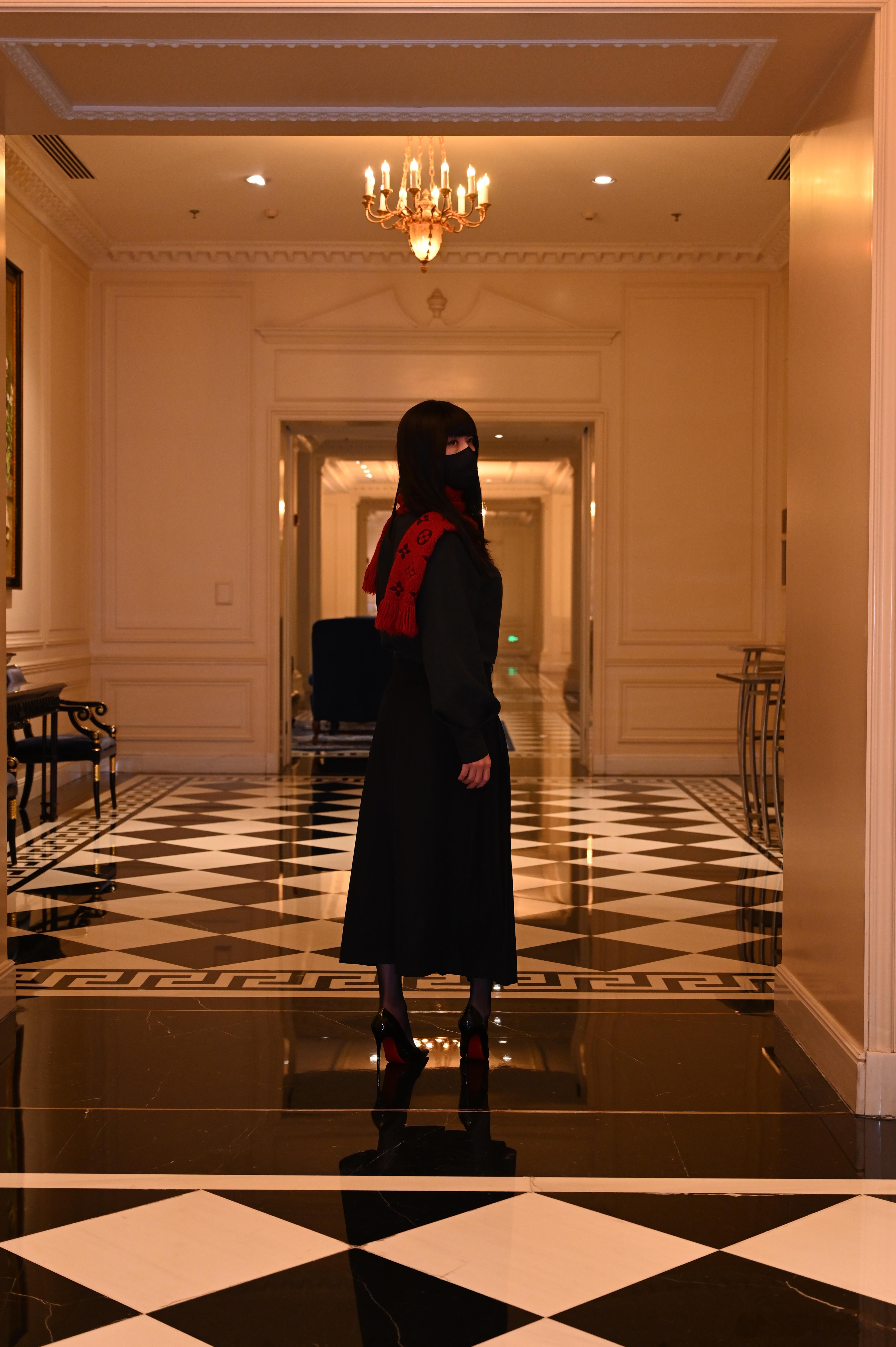 难得圣诞节假期来天津玩儿,趁着酒店氛围好,找了个摄影小哥哥来拍照。这套衣服是黑衬衫,黑长裙,黑丝,CL的KATE100,LV的红围巾点缀一下。原本设想的是走那种雍容华贵的贵妇风,但实际效果不太理想,早知道这样穿短裙性感一点的就好了。图是用手机简单修了一下,正片还没有好。 天津·天津丽思卡尔顿酒店
