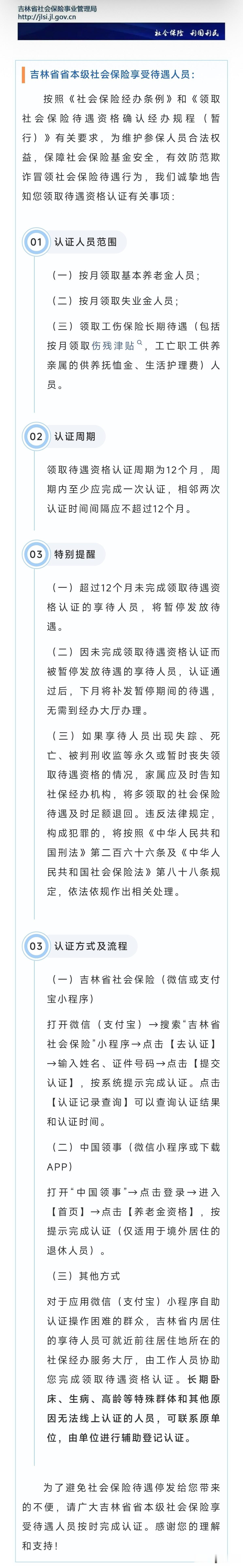【吉林社保重要提醒】12个月不认证,养老金可能暂停发!手把手教您轻松完成 全省的退休人员、领失业金和工伤长期待遇的朋友们注意了!省社保部门发布了最新的资格认证告知,这事关您的待遇能否按时足额发放,请务必花两分钟时间了解清楚! 一、核心内容解读: 1. 谁需要认证? 所有按月领取养老金、失业金、工伤伤残津贴、供养亲属抚恤金的人员都要参加。 2. 多久认证一次? 认证周期是12个月。简单说,您上次认证成功后,必须在接下来的12个月内再认证一次,不能间隔超过一年。 3. 不认证会怎样? 超过12个月未认证,待遇将暂停发放! 这是为了保障基金安全,防止被冒领。不过别担心,只要后续补认证成功,停发的待遇会在下个月一次性补给您,无需跑大厅。 二、给您的重要建议: 1.首选线上,方便快捷:强烈推荐使用 “吉林省社会保险”微信或支付宝小程序。按指引刷脸即可,儿女可以帮助操作。境外居住的退休人员,请用 “中国领事”APP。 2.牢记时间,提前操作:建议您给自己设个日历提醒,比如每年生日当月认证,形成习惯,避免遗忘。 3.特殊情况,寻求帮助:对于不会用手机、长期卧床或高龄的亲友,可就近去任何社保大厅,工作人员会协助办理。也可联系原单位进行辅助认证。 三、必须注意的事项: 1.信息变动及时报:如待遇领取人员出现去世、失踪、服刑等情况,家属务必第一时间主动告知社保机构并退回相关待遇。隐瞒不报、冒领待遇将承担法律责任,可能涉及犯罪。 2.认证结果自己查:线上认证后,可以在小程序内的 “认证记录查询” 功能中确认是否成功,记录好本次认证日期。 认证是为了守护好每一位参保人的“养老钱”“保命钱”。请大家相互转告,特别是提醒身边的老人,按时完成,确保待遇发放一路畅通!