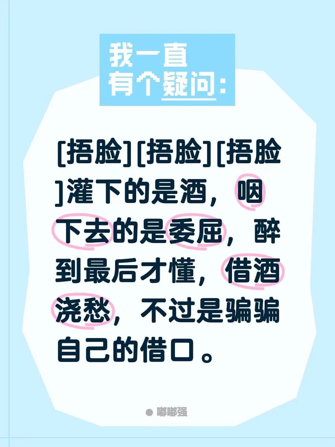我评论了@绊瘋绊儍绊傾郕 的作品:[捂脸][捂脸][捂脸] 灌下的是酒,咽下去的是委屈,醉到最后才懂,借酒浇愁,不过是骗骗自己的借口。喝的不是酒是眼泪 找一个可以喝醉的理由