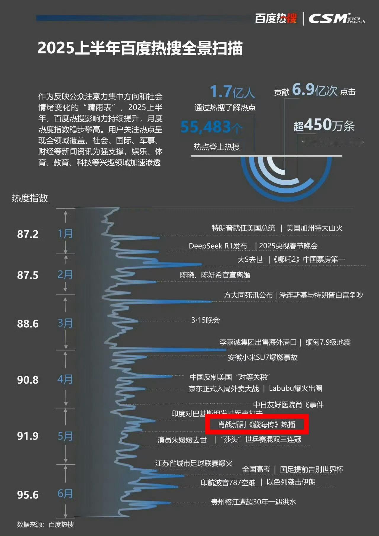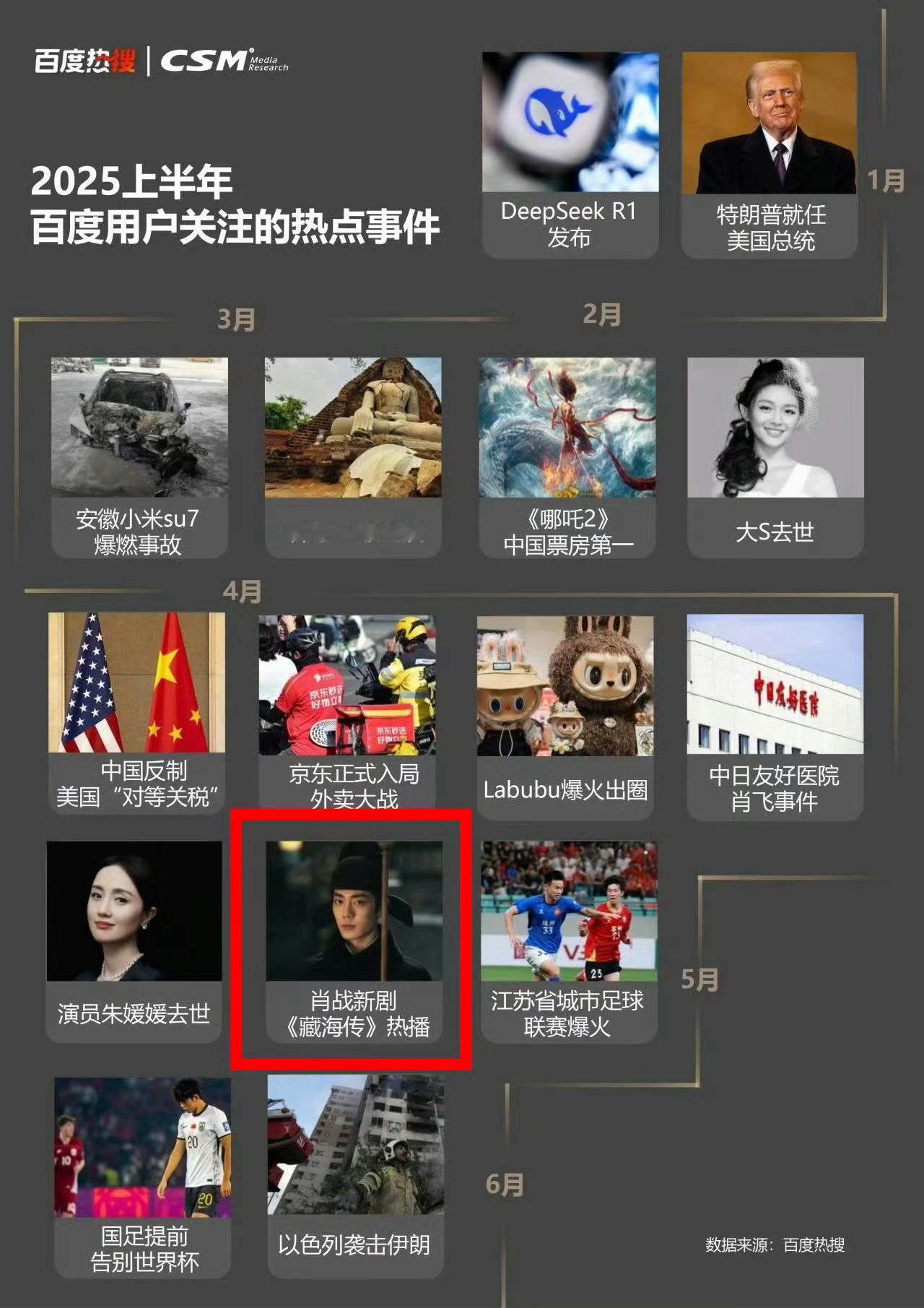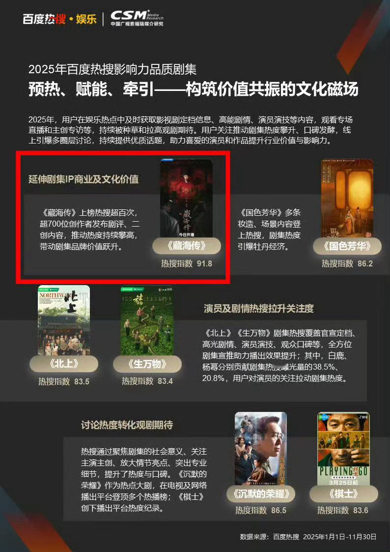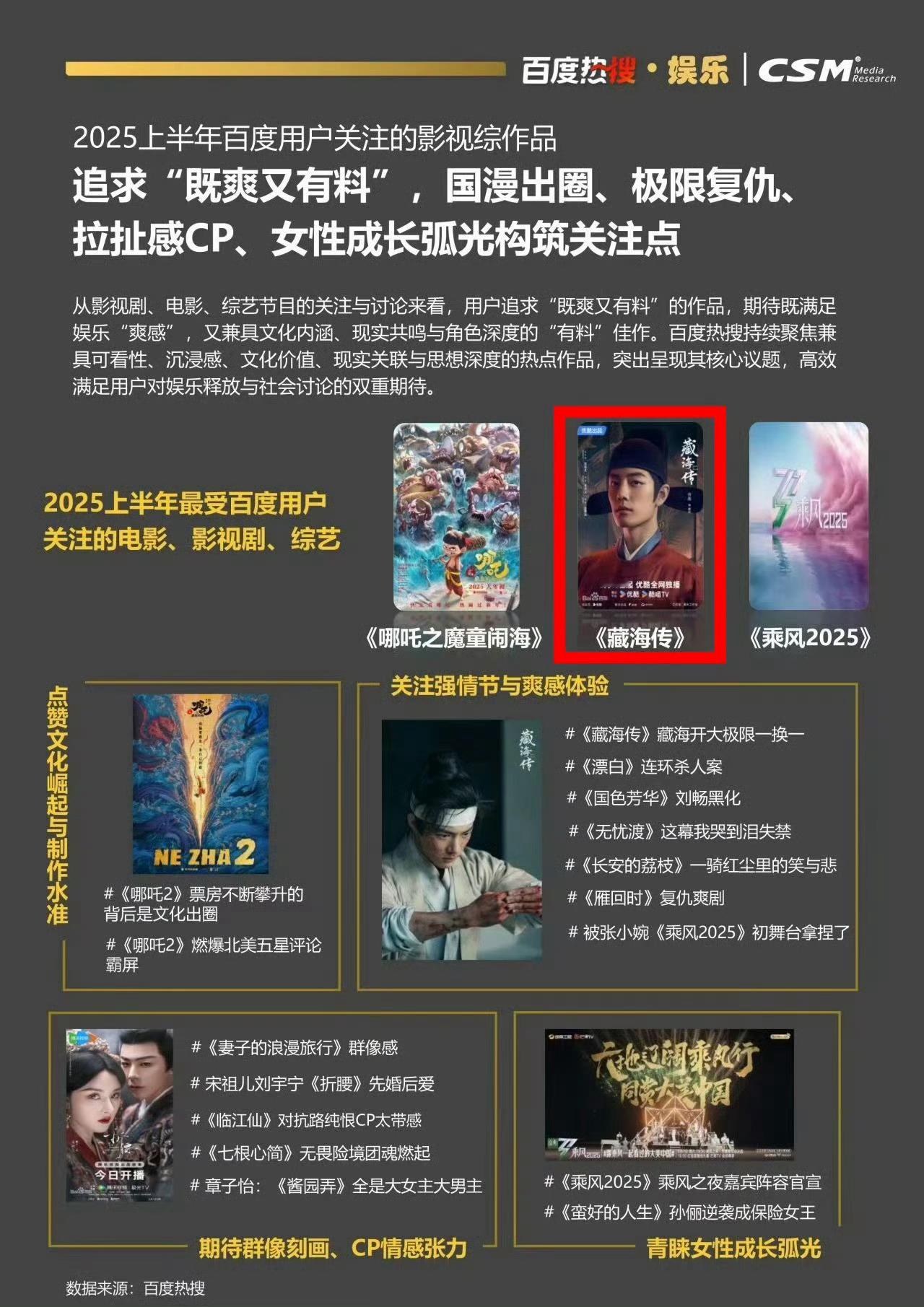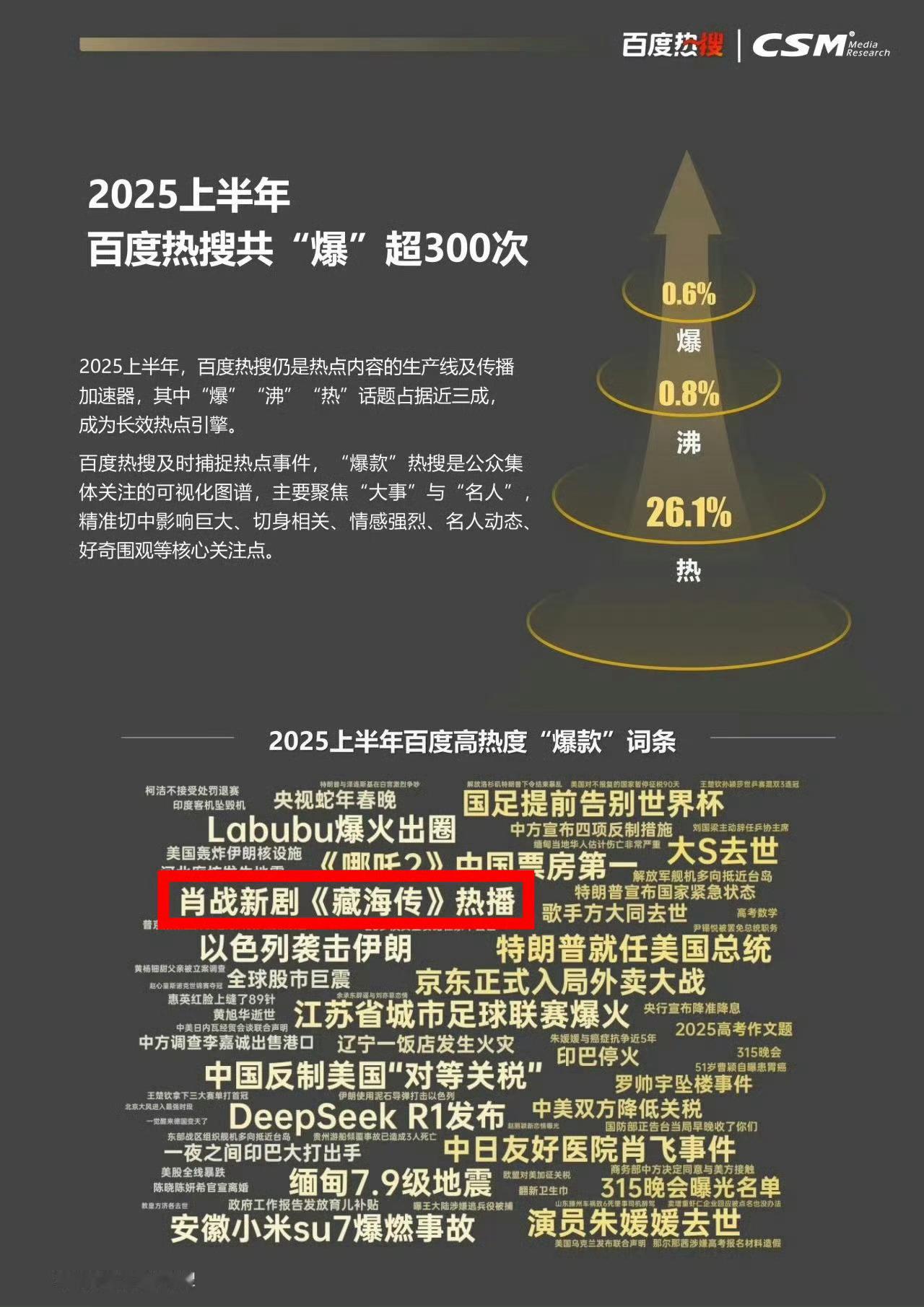 百度官方发布2025年底影响力报告的封面——肖战是封面上唯一入选的演员。其它上封面的,是哪吒、特朗普、DeepSeek和我们的大阅兵等。肖战凭借《藏海传》和《得闲谨制》成为2025年百度top影响力艺人,《藏海传》稳居2025年百度影响力断层第一的剧集,在商业和文化价值上一骑绝尘。早在年中总结时,肖战和《藏海传》就已被百度认证为年度热度最高的演员与剧集了。肖战今年作品和个人热度都双双创下亮眼成绩,成为文娱领域的现象级标杆。作品热度到个人影响力,肖战都凭借扎实的作品表现与国民度,实现了艺术价值与商业价值的双重突破,是2025年文娱领域影响力核心人物。