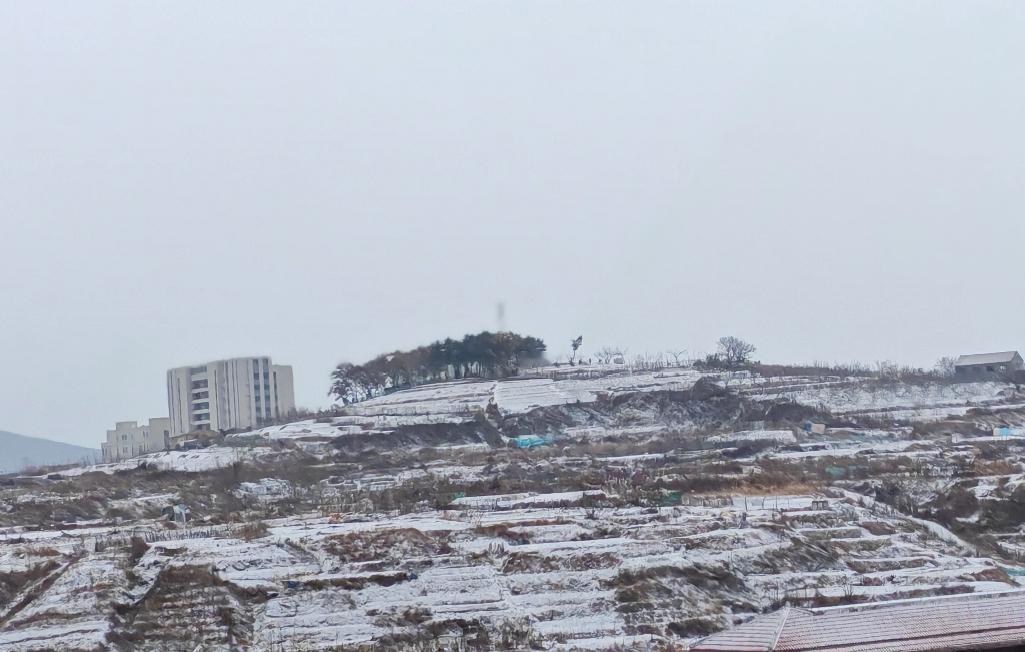2025年12月25日烟台下雪了,小山顶那几棵树成小山的标志,又有瑞雪的覆盖,山不在高,有雪则名。