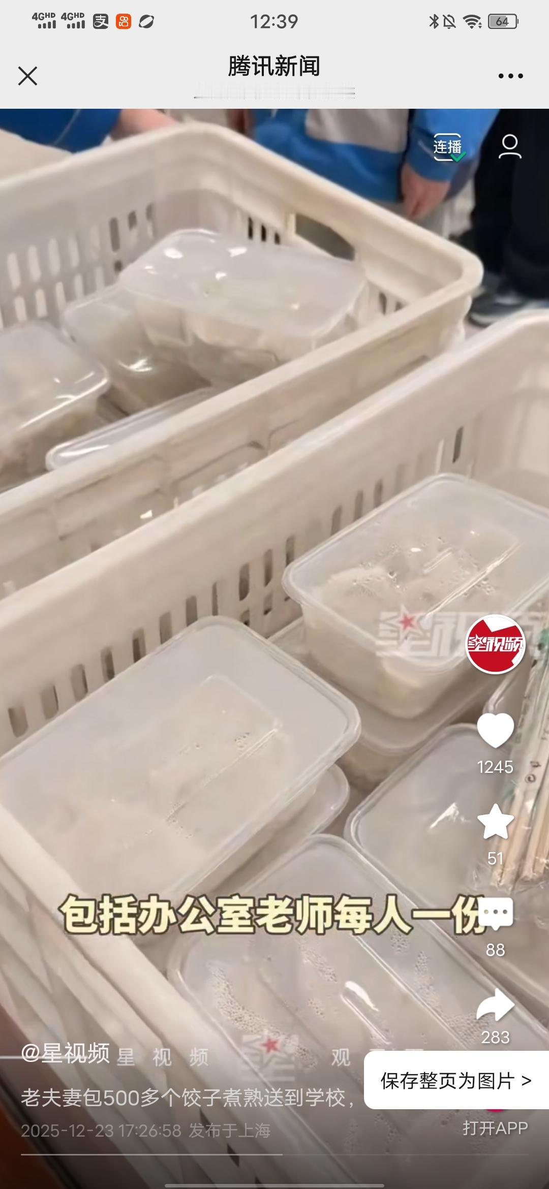 老夫妻包500多个饺子煮熟送到学校,让儿媳和全班学生吃,儿媳感叹:包的是对我的认同! 这是星视频发出来的消息,冬至当天,德州的一对老夫妻,一早出门采购食材,忙活了一下午,包了500多个饺子,还煮熟了,给儿媳,和儿媳班上40个学生,以及儿媳办公室几位老师,准备了人手一份。 儿媳说,这是公公婆婆对她选择的认同,对她责任的分担,爱屋及乌,老人家好有爱心,不仅是对儿媳的爱,也是对儿媳工作的支持,给他们点赞。 这个世界的人真的是没有两个一样的存在。大多数人都觉得这是一件很温暖人心的事,有极个别的总要出来说些煞风景的话,说什么对食品安全的风险,说真的,亲自动手做的,用心做的,自己吃的,这种情况下弄的,肯定跟一家亲人吃的弄得一样干净,再说,说这些酸话的人,有没有想过,自己平时点的外卖,有特别多的不管卫生的脏作坊?特别多的是发生在那种没有堂食专做外卖的,那如果到现场去看了,保准以后再也不敢点外卖,而实际又有多少是你能或者说你会看见的?还不是眼不见为净地吃下了。 反正这老夫妻做得这事,很温暖,很干净,至少心很干净,那么做的食物也就干净!