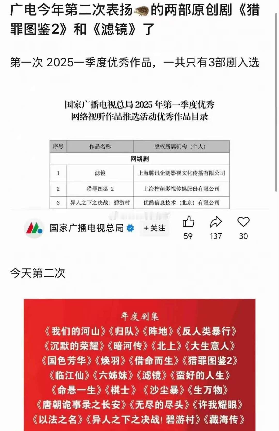 广电再次表扬檀健次两部原创剧檀健次主演的《猎罪图鉴2》《滤镜》太争气了!先是入选广电2025一季度优秀网络视听作品(全网仅3部网剧入选),如今又携手登上年度剧集榜单,拿下广电第二次官方表扬。两部原创剧接连获权威认可,檀健次的作品号召力和演技实力,果然名不虚传!