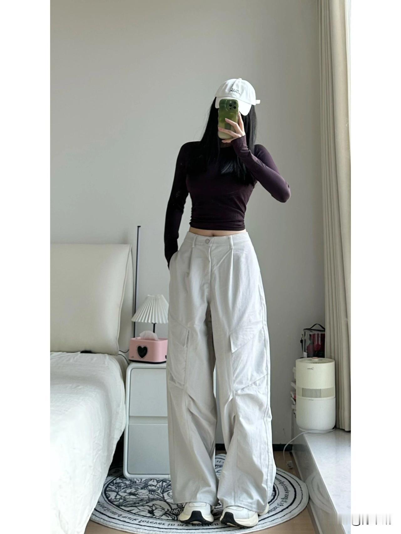 深紫裁衣束细腰,白衫阔裤步轻摇。 帽檐斜坠遮娇面,镜里风姿自俏娆。