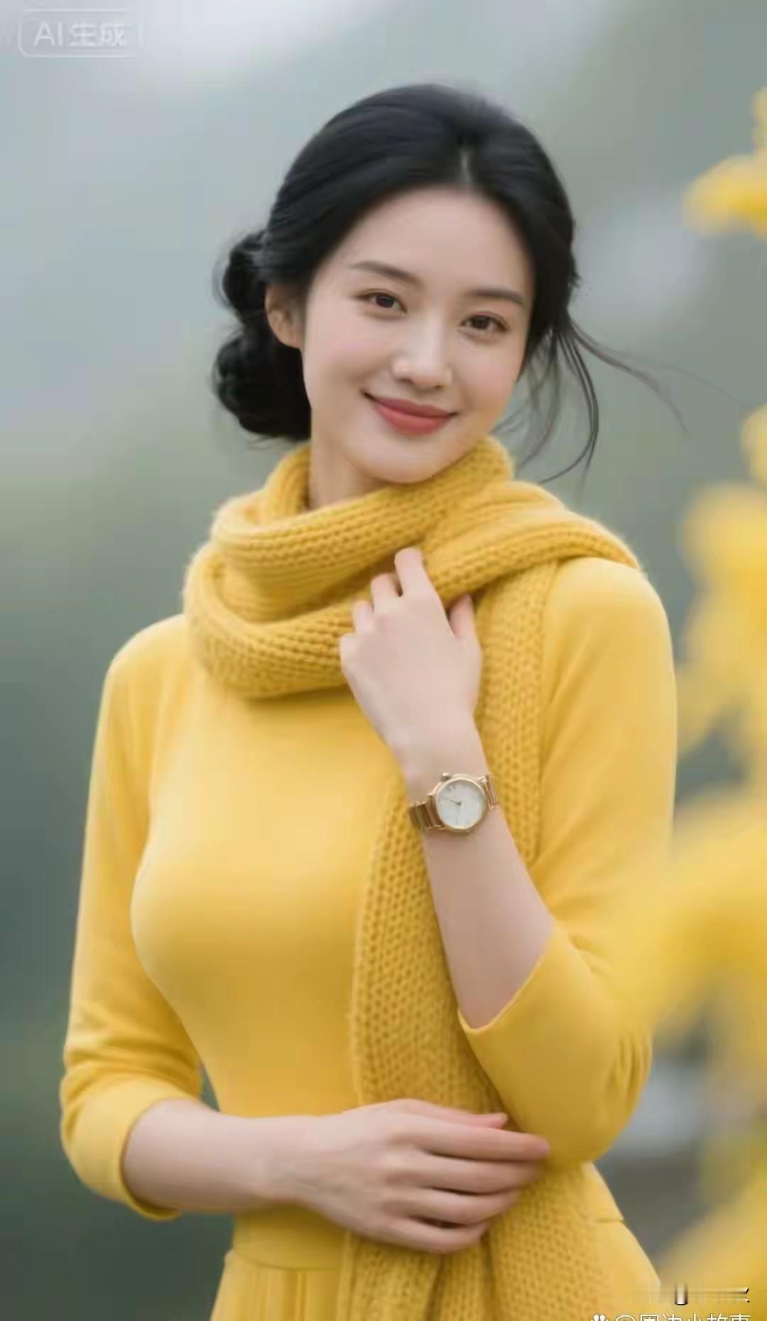花容月貌,梨花带雨 百媚千娇,粉妆玉琢 天生丽质,国色天香 黄连衣裙,黄色围巾 笑颜如花绽芳华, 眼眸藏星映流霞。
