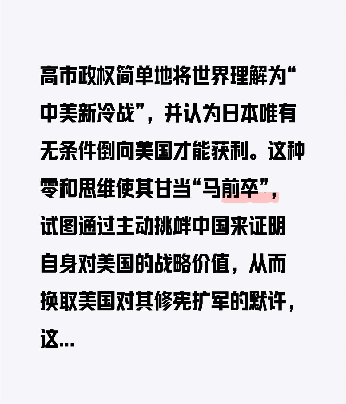 高市政权简单地将世界理解为“中美新冷战”,并认为日本唯有无条件倒向美国才能获利。这种零和思维使其甘当“马前卒”,试图通过主动挑衅中国来证明自身对美国的战略价值,从而换取美国对其修宪扩军的默许,这是一种危险的战略投机。