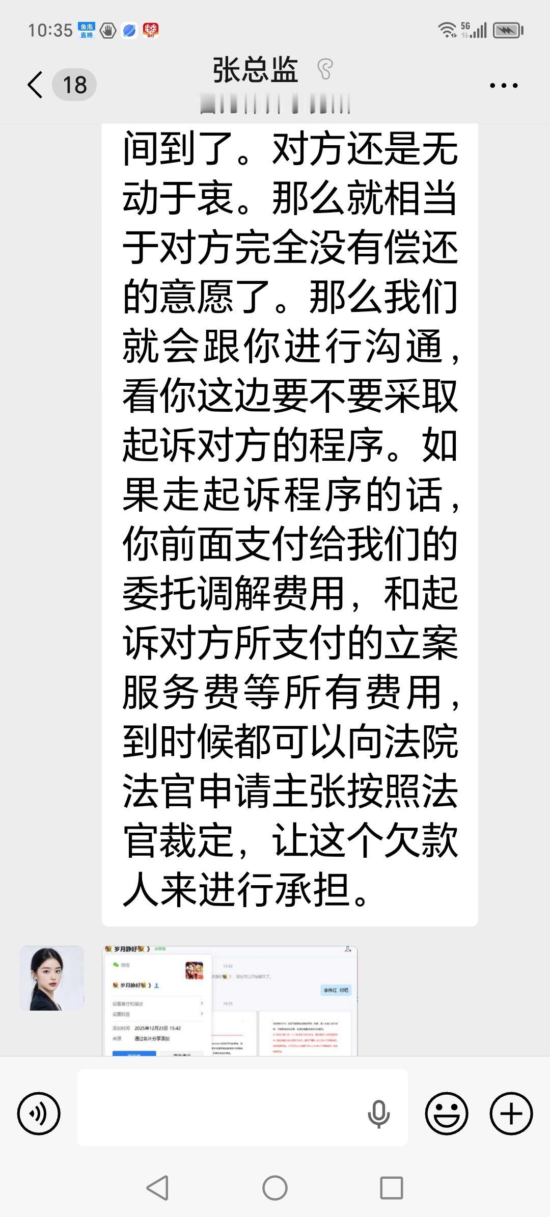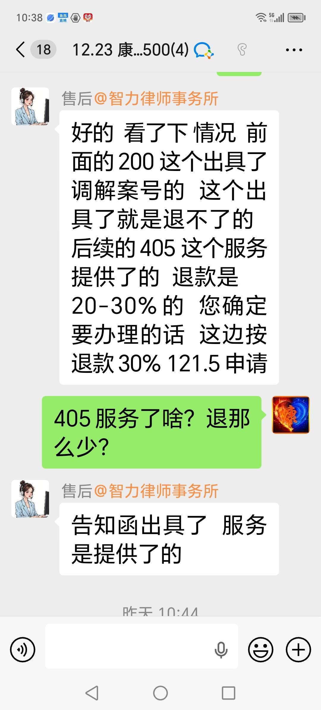 这头条上广告的律师事务所,多数就是为了挣钱在广告中各种引诱,说什么欠款要不回来,律师要500.不要信,要两三百也不要信,我们全程为您服务,一分钱不要,等到钱要回来了,再给我们服务费。看着确实很不错,这不我就被这个广告动心了。我们几个曾经在2020年给一个甘肃省甘谷县八里湾乡一个叫李伟红的骗子老板干了一个多月(当时在兰州市碧桂园三期干的道路管廊)。现在把我们拉黑了,欠了将近五万元。看了广告,我想还行,毕竟钱要回来给他们多给点都行,于是就联系了他们,他们说要你一个人的还是全部要,我说全部要。于是他们说我给你个建议,你想你的一万元要容易还是将近五万元要容易?我说肯定是一万多容易,于是建议先要我的,我说行,他们就说先给200元,用于调取当事人资料,我当时准备放弃了,但也存在侥幸心理,于是转了200.他们就说经过调取李伟红资料,他的征信啥都好着呢,微信,支付宝都正常使用。我们是可以要回来的,只不过要发律师函。这还需要费用405元。而且后续还可以退的。我当时想着不行就等于我赌博输了,于是我又打了405元。然而就说已经给李伟红发微信威胁了。让我等消息,我一听就知道我上当了,结果第二天他们问我对方你联系我给钱?我说那有那么容易,他们就说看来要起诉了。他才能给钱,我说起诉怎么办,他们说起诉要请律师,什么的,产生费用共需我先交3380元,这个费用胜诉了由李伟红承担。我说要不回来呢?他们说你这个肯定胜诉能要回来,我说你先操作,钱要回来给你们,对方一个女的说叫什么张总监的,尽然说天下哪里有免费的午餐?你个穷光蛋付不起几千元,我当时气坏了,说你们骗子。然后再没理她,打电话叫他们退款,结果还要我签字什么的,最后只退来121.5元。两天就被忽悠去了将近500元。所以以我亲身经历告诫有我类似我的条友们,遇到这种广告,不要轻易相信,造成不必要损失。附这个事务所图聊天记录,农民工真可怜啊,流血流汗,挣的钱要不回来,投诉无门啊