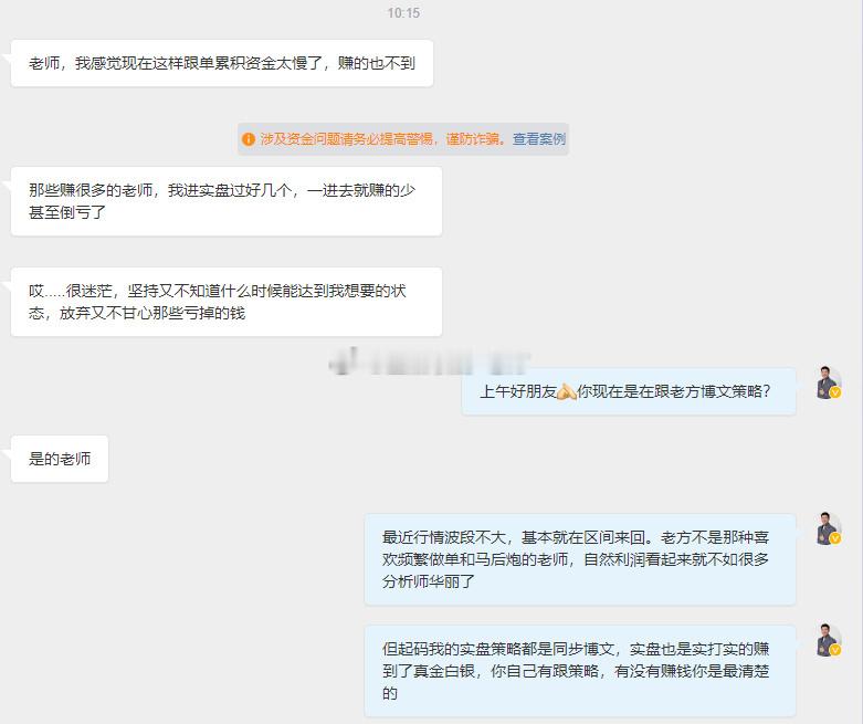 大家看看这位粉丝朋友的倾诉,有没有照镜子的感觉,我相信部分朋友一定有。我从不标榜自己如何如何。因为但凡跟过我微博策略一段时间的,哪怕因为一时的利润选择了其他老师,兜兜转转的选择还会是我。没走到这一步的朋友不一定能理解这种感受。就像买衣服一样,一件衣服表面看起来多潮多好看也许并不保暖,另外一件衣服看起来平平无奇,但冬天穿在身上就是能让你全身心的暖和,要温度也许只是不那么好看(看起来没有马后炮积累资金那么快)要风度也许就容易冻死在这个冬天(进去了才发现和他博文表现的天差地别)金价 黄金 金油趋势实战大师-老方