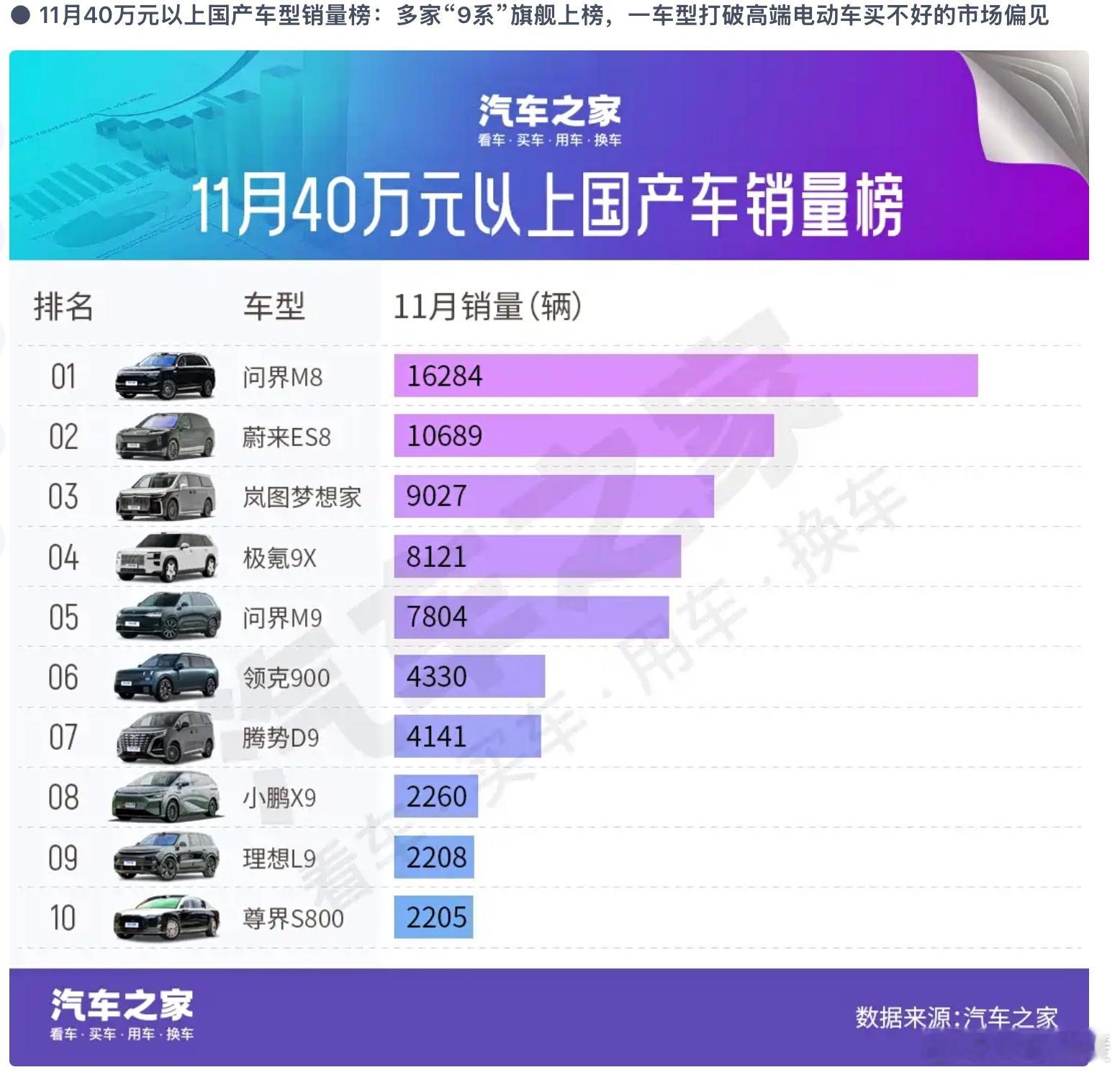 11月40万元以上车型销量榜与国产豪华车型销量榜出炉40万以上的豪车销量榜里,咱中国品牌太争气了,前十中占了四席!不过BBA在高端市场的地位还是没动摇,依旧稳稳占据不少位置国产车型榜单中,“9”系列产品整体表现可圈可点,榜单前十的席位几乎是被不同品牌瓜分,全是当下主流新势力旗舰车,也正是这些国产车的强势崛起,才算真的给霸榜多年的BBA来了波冲击