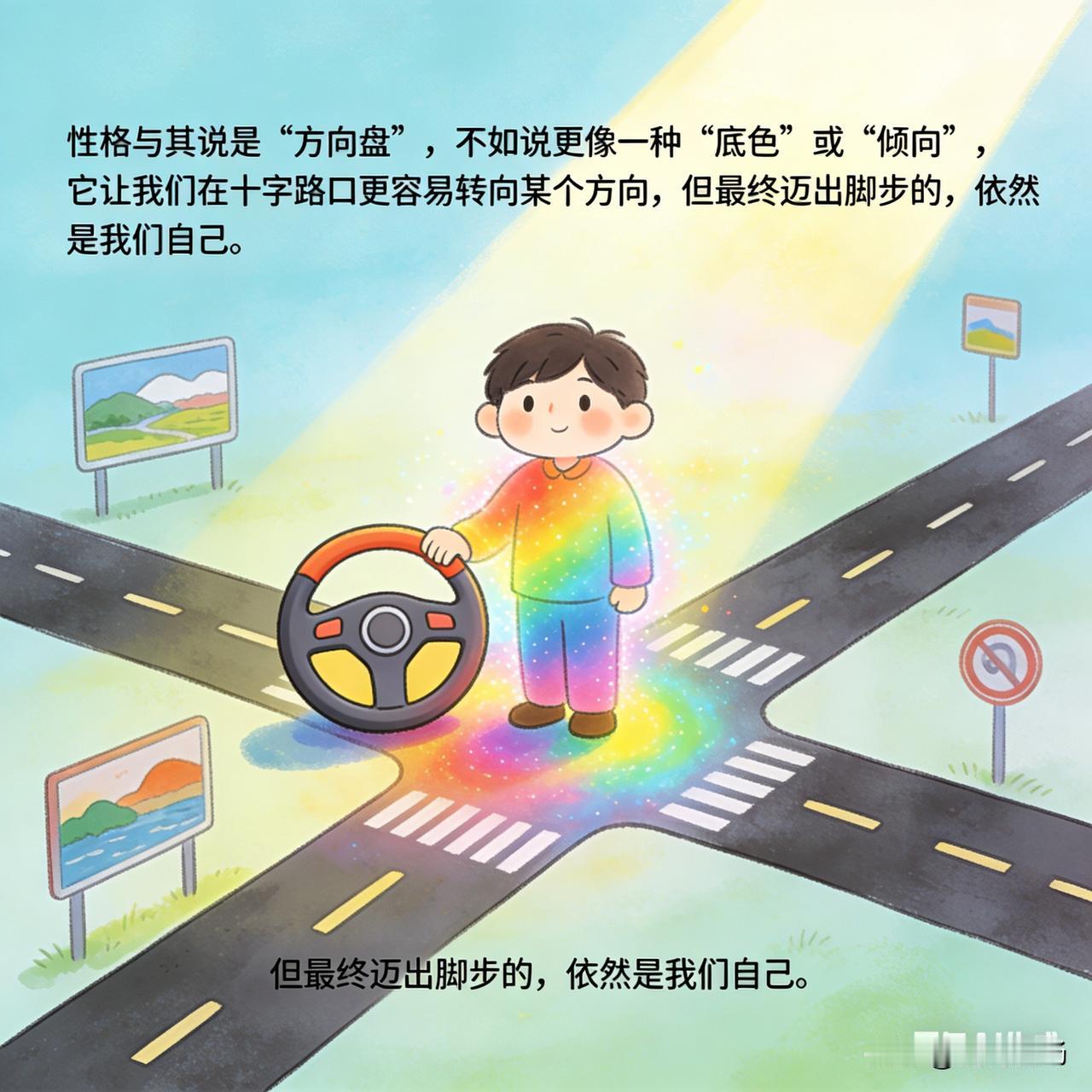 性格是你人生的“导航”,不是“方向盘” 命运是一张被不断重绘的地图,性格就是握在我们手中的那支笔。它无法预先规定终点,却深深影响着每一次落笔的弧度、每一处着墨的深浅。 有人相信性格决定一切,将人生际遇全然归因于内向或外向、谨慎或果敢。这实则简化了生命的复杂性。相同的性格底色之下,有人因勤勉而攀峰,有人因懈怠而沉沦,可见后天的选择与环境的力量同样举足轻重。性格与其说是“方向盘”,不如说更像一种“底色”或“倾向”,它让我们在十字路口更容易转向某个方向,但最终迈出脚步的,依然是我们自己。 然而,性格的影响力不容小觑,它渗透在人生的褶皱里。一个天生细致的人,或许更易在需要缜密的领域避开粗心的陷阱;而一个乐于交际者,可能在机遇的网络上拥有更多节点。这就是性格的“路径影响”——它不设定目的地,却很大程度上勾勒了我们走过的道路。它像一位沉默的导航,虽不强迫,却总在耳边提示着最符合我们本性的那条岔路。 真正的人生智慧,在于认识并超越这种“笔迹”。了解自身性格的倾向,不是为了认命,而是为了清醒地抉择:何时可顺势而为,借力性格的东风;何时又需逆性而上,在必要的时刻超越本能的舒适区,拓展生命的疆界。性格给出了起手的风格,但人生的杰作,终究由我们在每一刻的觉知与选择中完成。