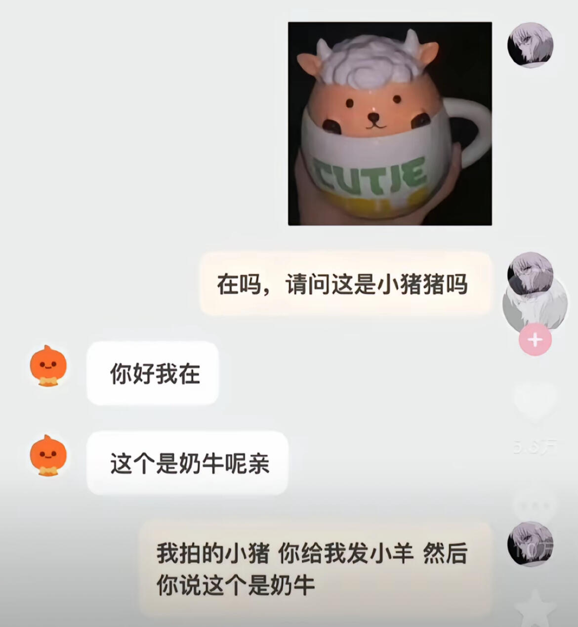 我拍的小猪 ,你给我发小羊, 然后你说这个是奶牛