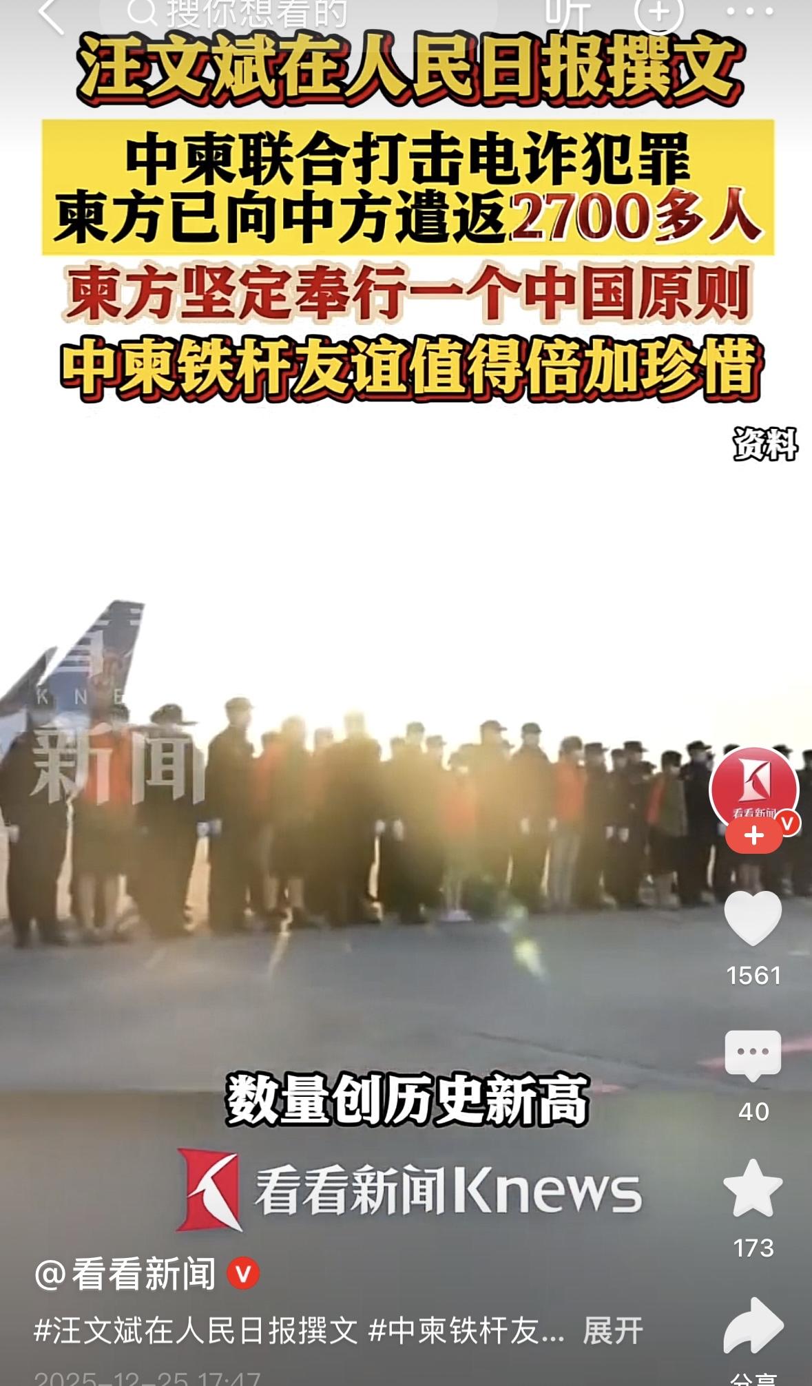 汪文斌在人民日报答辩文章,披露一个重要事实,中柬联合打击电诈行动,今年一年,已经遣返电诈犯罪分子2700名,创历史新高!就想问一句,还有多少没有遣返?留他干啥?都给弄回来呗!泰国打击电诈,柬埔寨也打击电诈,这不是好事吗?