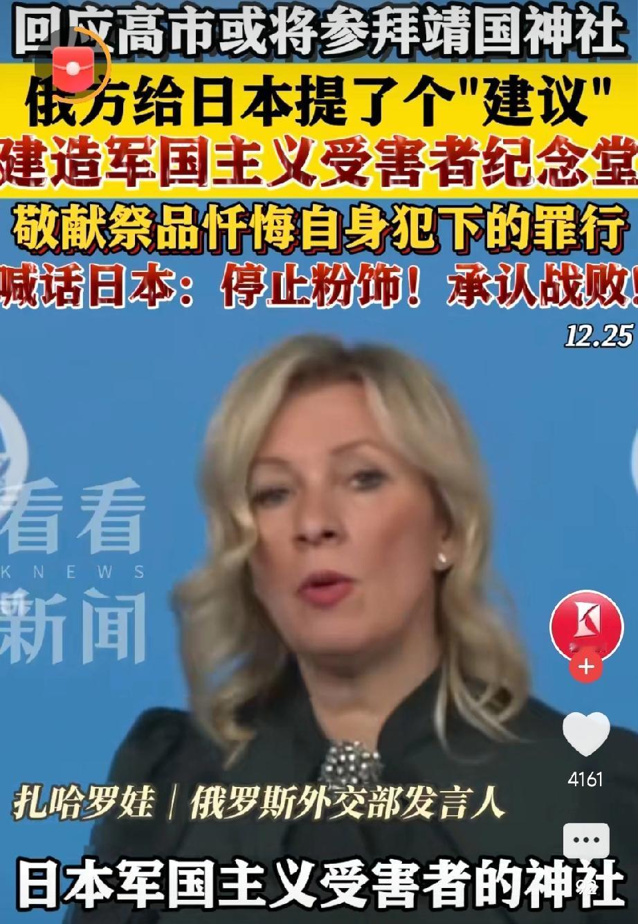 扎哈罗娃给日本人这个建议不错!(在我看来)在日本境内建造一座祭奠日本军国主义受害者的神社,可以每年一次,甚至更频繁地前往献祭以赎还自身罪行。 不得不说,扎哈罗娃对日本的这份关爱还是充满了真诚。因为只有这样,日本人才能真正认清日本军国主义给日本人所带来的危害,认清军国主义给日本人民所造成的痛苦,才能深刻反省日本军国主义在二战所犯下的滔天罪行,才能防止日本军国主义东山再起。 虽然扎哈罗娃这个不错,但还是不太完美,毕竟还有一个鬼厕摆在那里,还有不少日本人拜鬼。