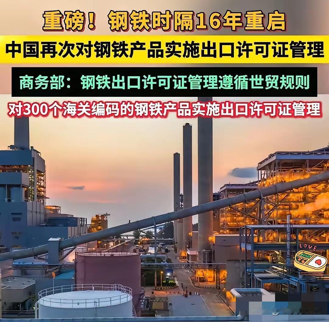 “稀土牌”还没降温,中国又亮出关键一招,2025年12月,商务部和海关总署宣布,从2026年1月起,对300种钢铁产品实行出口许可管理,从钢坯到成品材都涵盖在内。这可不是简单“少卖点货”回应“倾销”指责,而是应对全球贸易保护主义的精准举措,更是中国钢铁业从“靠规模卖货”转向“靠质量赚钱”的关键布局。 这是时隔16年重启该制度,2025年前11个月钢出口1.077亿吨、同比增6.7%逼近历史峰值,均价同比下跌10.3%(来源:每日经济新闻2025年12月报道)。 低附加值的钢坯出口量增至去年3倍,价格却下跌15.3%,低价竞争模式引发大量贸易摩擦(来源:中国经济网2025年12月报道)。 2024年至今,钢铁行业遭遇50多起反倾销调查,越南、印度对相关产品加征反倾销税,最高税率达38.02%(来源:每日经济新闻2025年12月报道)。 出口需提供产品质量检验合格证明,再生钢铁原料需符合国家标准,低质量产品将被限制出口(来源:环球网2025年12月报道)。 商务部明确新政不设出口数量限制,核心是严把质量关,引导企业放弃低价竞争(来源:人民网2025年12月报道)。 欧盟即将征收碳关税,国内钢铁行业已纳入全国碳市场,新政将助力企业向“绿钢”方向转型(来源:中国经济网2025年12月报道)。 目前已有领先企业出口碳减排50%的绿钢,凭借技术优势获取溢价,这将成为行业未来的发展方向(来源:每日经济新闻2025年12月报道)。 高端板材出口占比预计从37%提升至45%,企业需重点布局轴承钢、高温合金等高附加值产品(来源:市场拾荒人2025年12月报道、中国钢铁工业协会2025年12月补充数据)。 传统市场贸易壁垒持续提升,新政将引导企业开拓非洲、拉美等新兴市场,分散贸易风险(来源:每日经济新闻2025年12月报道)。 本文为个人贸易类评论,非新闻报道,仅基于公开权威信息整理,不构成投资建议及贸易指导。 各位读者你们怎么看?欢迎在评论区讨论。
