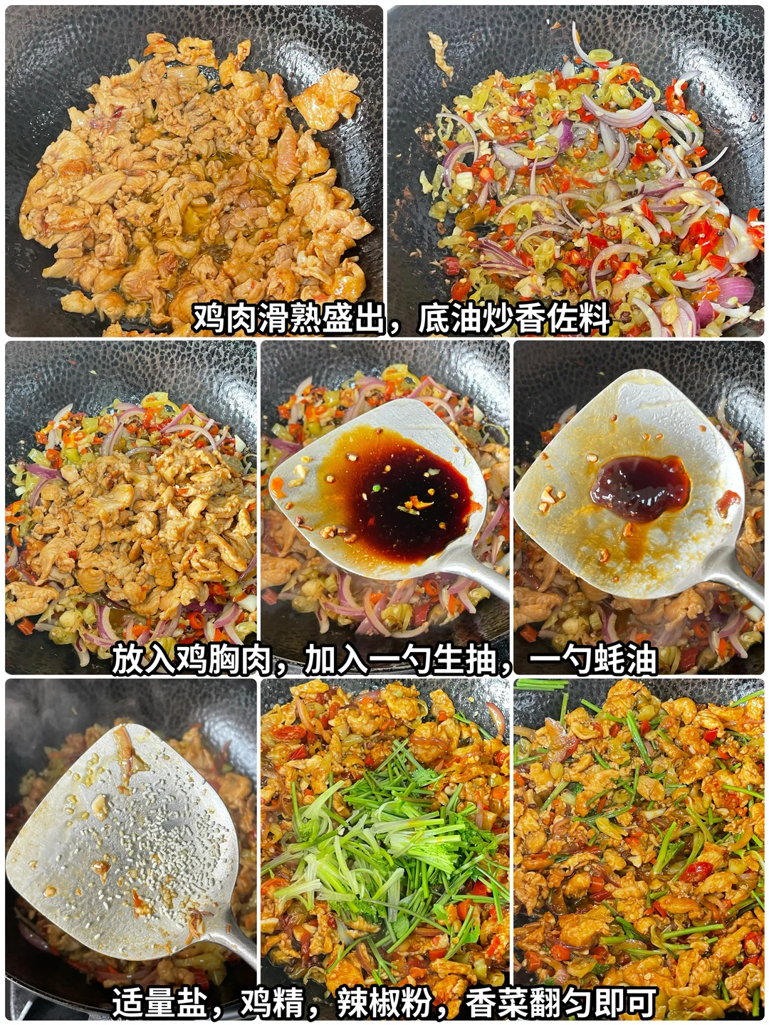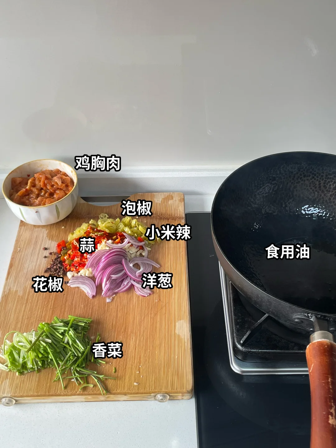 3⃣️起锅烧油,油热将鸡胸肉滑熟盛出,锅留底油炒香泡椒、小米辣、洋葱,蒜,花椒,然后放入鸡胸肉,加入1勺生抽,1勺蚝油,适量的盐,鸡精。再来一勺辣椒粉和放入香菜段翻匀即可出锅,这样做出来的小炒鸡胸肉真的巨好吃,喜欢的姐妹试试吧