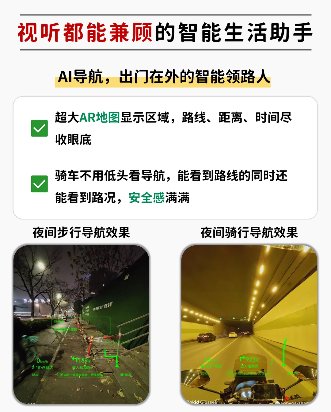 骑车的时候看导航是一个很头疼也很危险的事情,一个不注意就容易摔车。但是有了乐奇AI眼镜之后AR路线直接浮现在眼前,抬头看路看导航两不误,科技感和安全感都有了!
