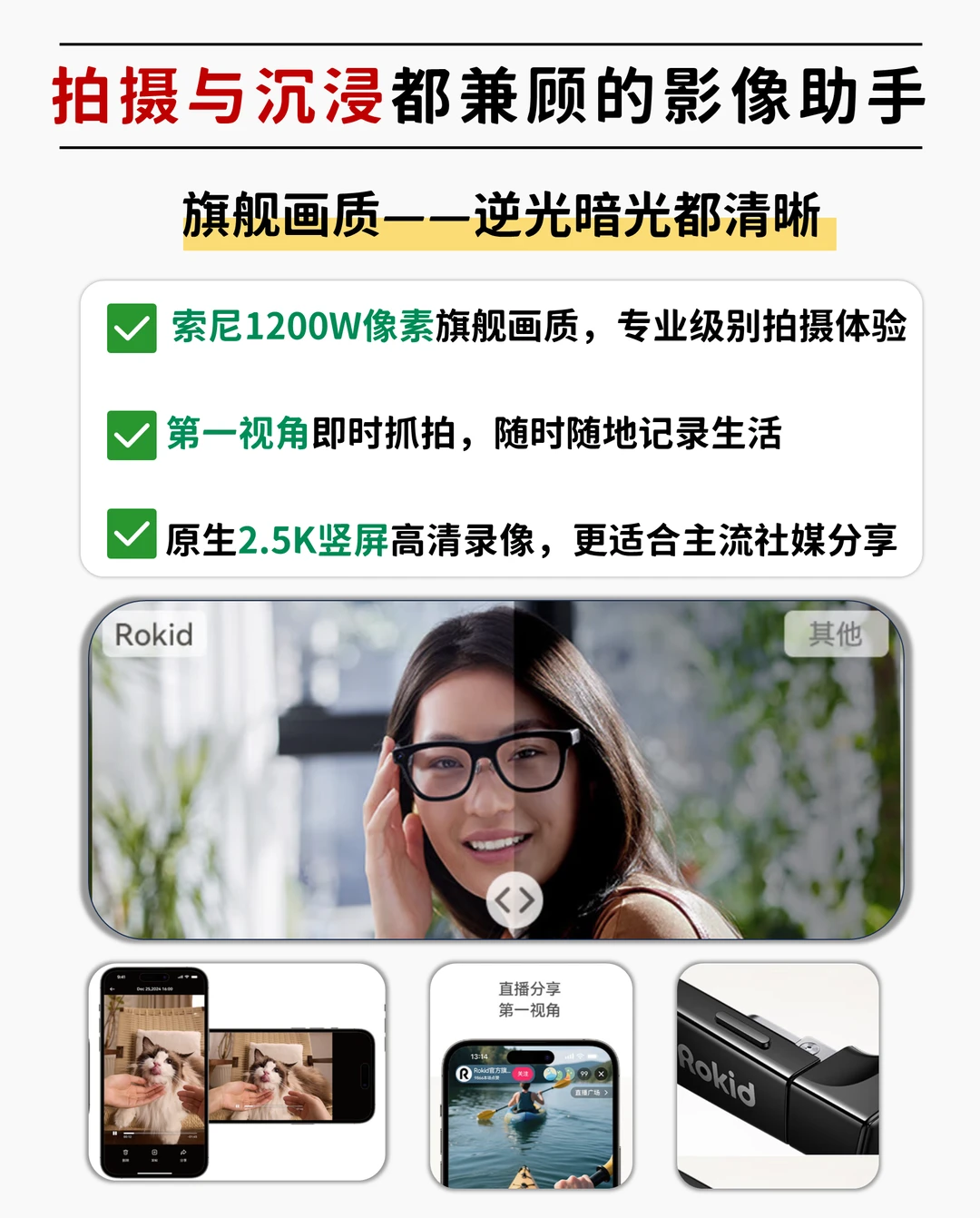 ·索尼传感器+第一视角拍摄,抬手一碰就可以开始拍照或录视频,不用担心错过生活中那些想要记录的精彩场景,有时候拍到比拍好更重要~