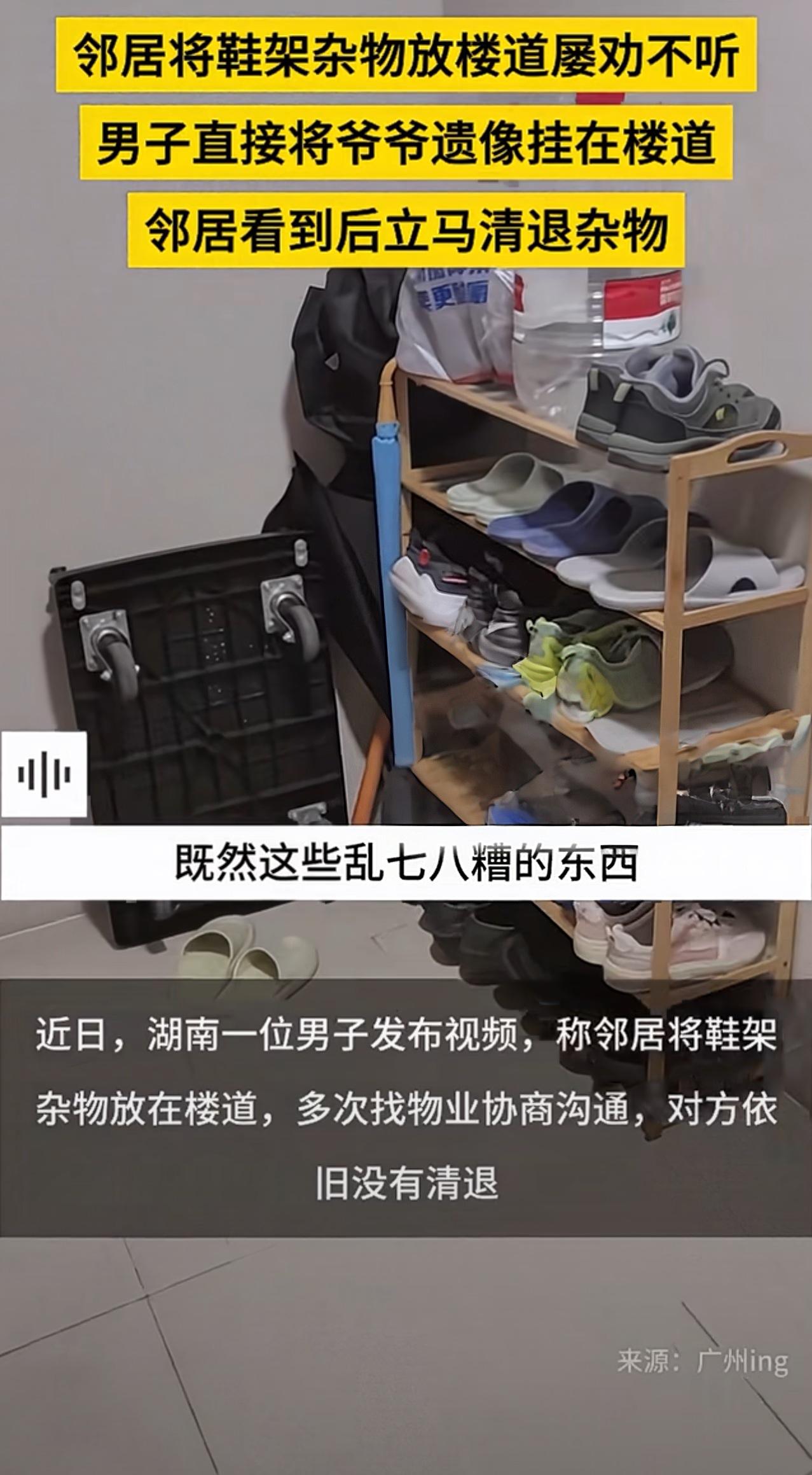 这种劝退方法太绝了![捂脸] 近日广东网友成功劝退领居在公共区域门口的鞋架子! 邻居将鞋架杂物放楼道屡劝不听,男子直接将爷爷遗像挂在楼道,邻居看到后立马清退杂物。 男子吐槽:“既然门口这一堆乱七八糟的东西没人管得了,那我放一张我爷爷的遗像照片,也不能有人管得了我。” 果然选对方法很重要,没等多久,领居果断清空鞋柜,并拍视频证明表示暂时性撤退,实在是打不过。[呲牙] 爷爷心想我都走了,还的出来给你解决问题![赞] 网友表示我爷爷还在,估计的下辈子能收拾他。