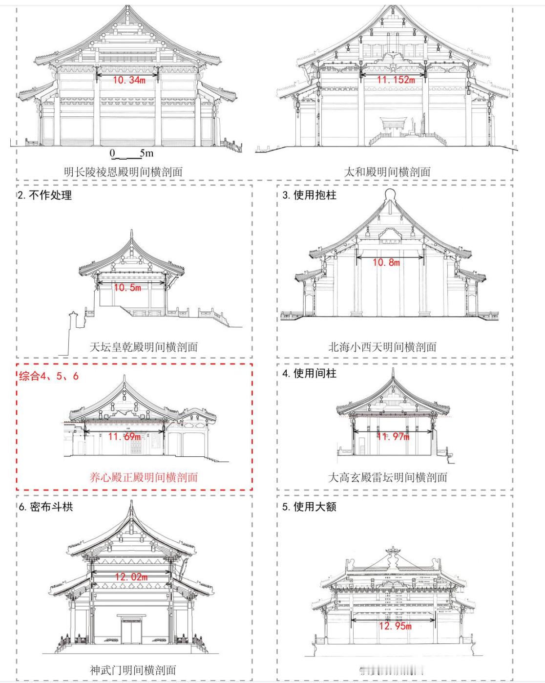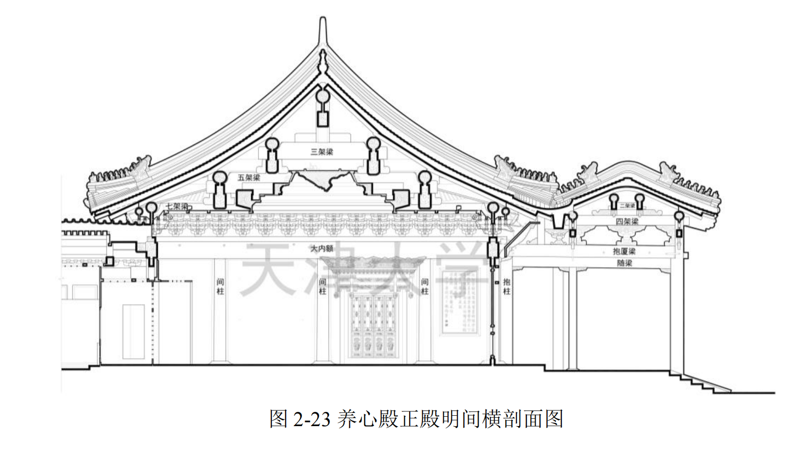 养心殿正殿为明代建筑,在明嘉靖开始就是帝王居所,在梁架设计上,与一般的中型单檐建筑还有所不同,其用的是大型官式殿堂核心跨才会用的七架梁,而且养心殿的用法是前后通檐七架梁,跨度达11.69m,超过太和殿核心跨(11.152m),等同于明清大型殿堂核心跨的极限跨度。 那为什么规模上并不是大型殿堂的养心殿,其设计会如此不同呢? 可以在历史上找渊源。 《唐会要》文宗太和六年六月敕书,引《营缮令》条文里有:“非常参官,不得造轴心舍,及施悬鱼对凤瓦兽通栿乳梁装饰”,其中,“通栿”应指《营造法式》卷第三十-四架椽屋通檐用二柱中的“通檐”,也就是不施内柱的一类建筑结构,但唐代普通民居,由于规模有限,定当存在大量不施内柱的小型建筑,那为何在《营缮令》里通栿会特别作为五品以上常参官的特权建筑结构呢,《营缮令》里又有:“三品以上,堂舍不得过五间九架,厅厦两头;门屋不得过三间五架。五品以上,堂舍不得过五间七架,厅厦两头,门屋不得过三间两架。”府邸门屋一般均为中柱式结构,所以不会为通檐,在此处律令行文里,通栿对应的,应该是堂舍做法,也就是宅邸正堂,所以在这里隐含的就是,非常参官,不得用通檐九架梁(对应宋八椽栿)、不得用通檐七架梁(对应宋六椽栿)的特殊结构。这才是此禁限的关键,即限制普通官员等使用极大的层叠梁栿营造出巨大的,可能在6~8椽规模的无柱空间的正堂,含元殿根据考古发现,即实现了跨度达6椽的无柱空间。这里先不讨论跨度达8椽的无柱通檐空间是否能实现,应注意的是,这条律令折射出的深刻的含义是跨度较大的长栿,在唐代是有一定等级含义的,其结构难度、用料的大小、空间的跨度,均与一定的权力挂钩,所以长栿的意义就是代表了一定的高等级建筑做法,尤其通檐长栿更加尊贵。 而唐《营缮令》对后世建筑等级的禁限有深远影响,不止宋代照搬了大量唐代条文,在明代也能看到它的影子。 故宫养心殿前殿自嘉靖、万历开始即为皇帝正寝,其年代根据题记显示,还是嘉靖十四年之原物,而前殿作为一座中等规模的单檐歇山顶建筑,也采用了七架梁通檐的形式,其跨度(11.69m)直抵明清大型殿堂进深的极限跨度(12.02m),这种手段无疑是长栿的等级属性在发挥作用。图片来自于天津大学王凤莹硕士论文《养心殿正殿大木形制研究》,文字博主自撰