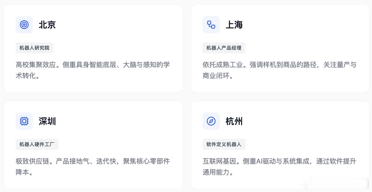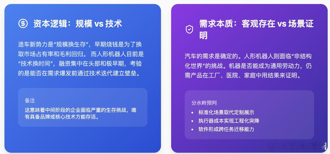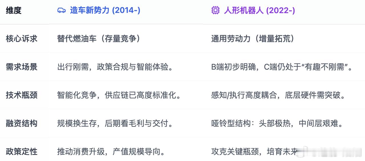 特斯拉带火的两波科技创业热潮,前后脚很有看点 —— 新势力造车已走完从质疑到盈利的周期,人形机器人则在 2022 年后成为新焦点。中国机器人创业呈多中心格局,北京重底层研究、上海偏量产落地、深圳强硬件、杭州靠软件定义,和当年造车集中布局不同。两者虽都有资本政策加持,但造车需求明确,机器人要证明通用劳动力价值,技术瓶颈更底层,C 端刚需仍待培育。资本逻辑也不同,造车是规模换生存,机器人靠技术换时间,能否落地标准化场景、降本成熟才是产业化关键。