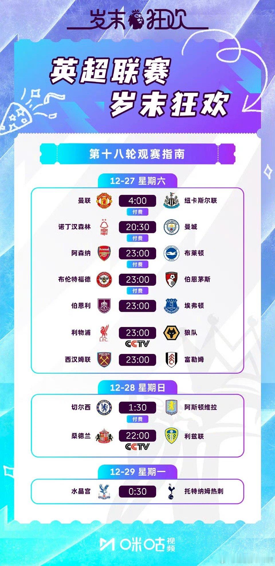 英超联赛岁末狂欢,第18轮观赛指南已备好!今晚4点,