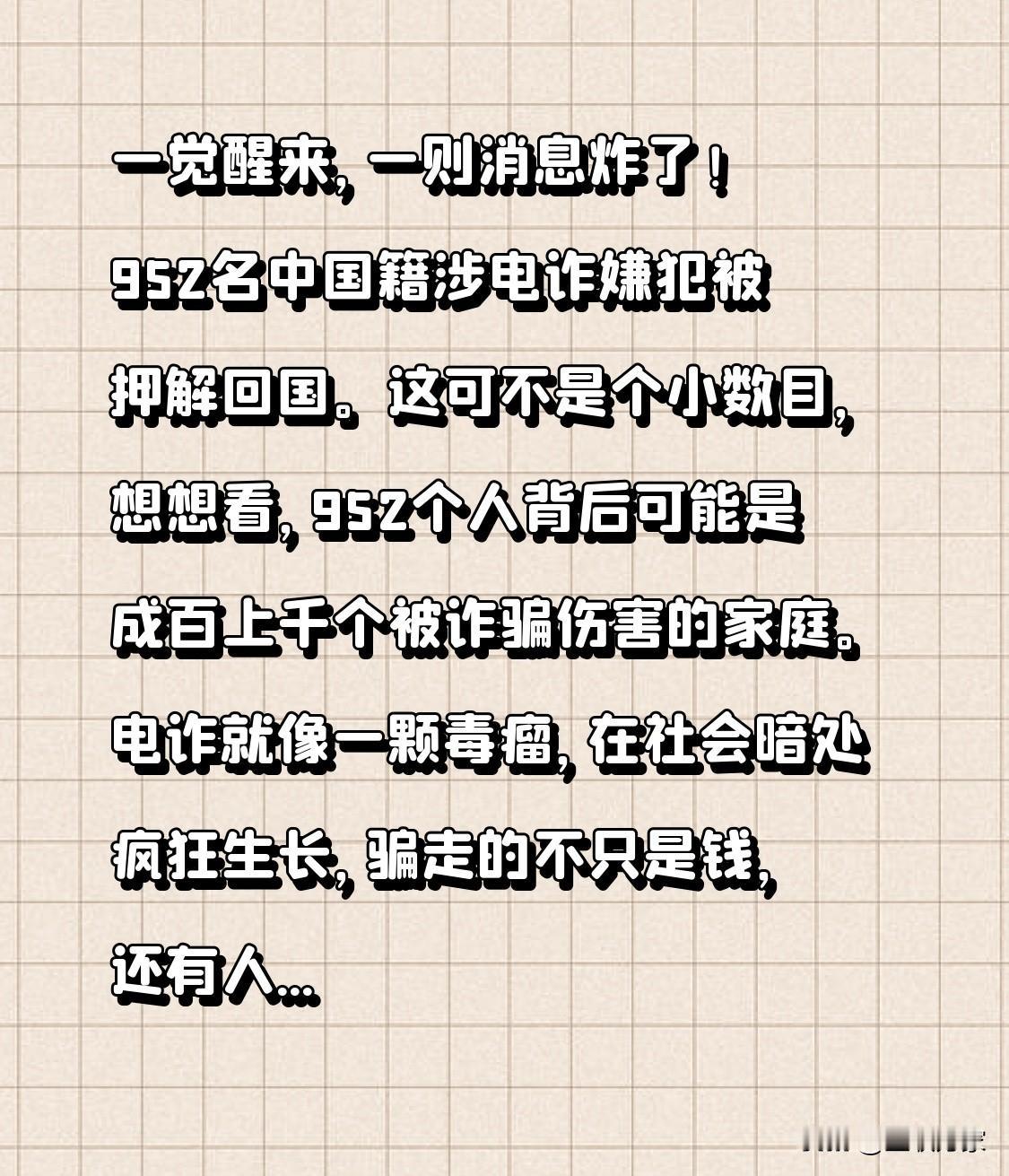 一觉醒来,一则消息炸了!952名中国籍涉电诈嫌犯被押解回国。这可不是个小数目,想