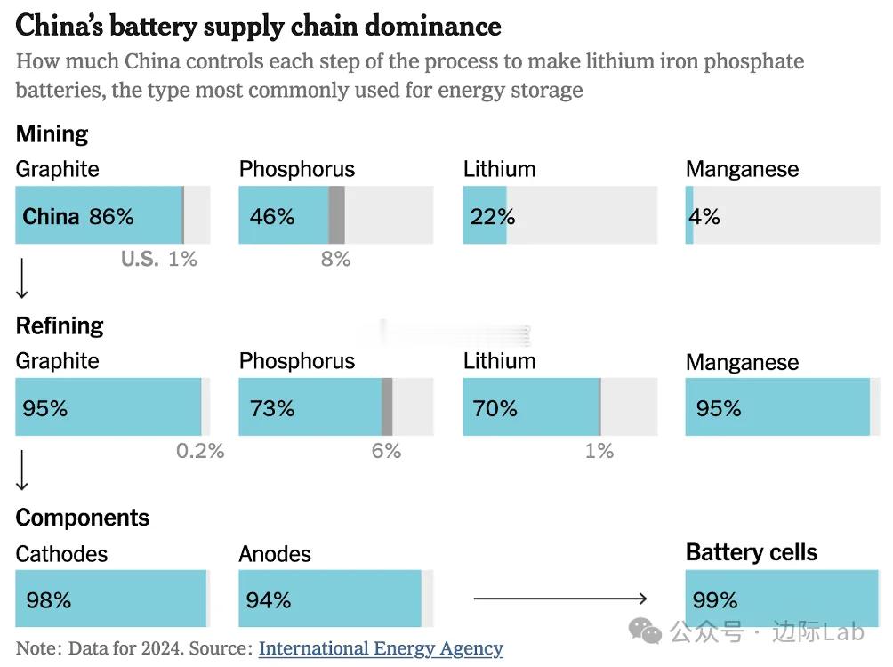 2024年全球磷酸铁锂(LFP)电池产业链呈现出极度集中的单极化格局,中国企业不仅垄断了99%的电池单体制造,更在正极(98%)与负极(94%)等关键组件环节建立了绝对壁垒。这种控制力向上游延伸至原材料深加工领域,尽管中国本土锂矿开采量仅占全球22%,但高达70%的锂精炼、95%的石墨精炼以及95%的锰精炼均在中国境内完成,实质上切断了西方国家独自将开采能力转化为终端产品的可能性。来源:纽约时报