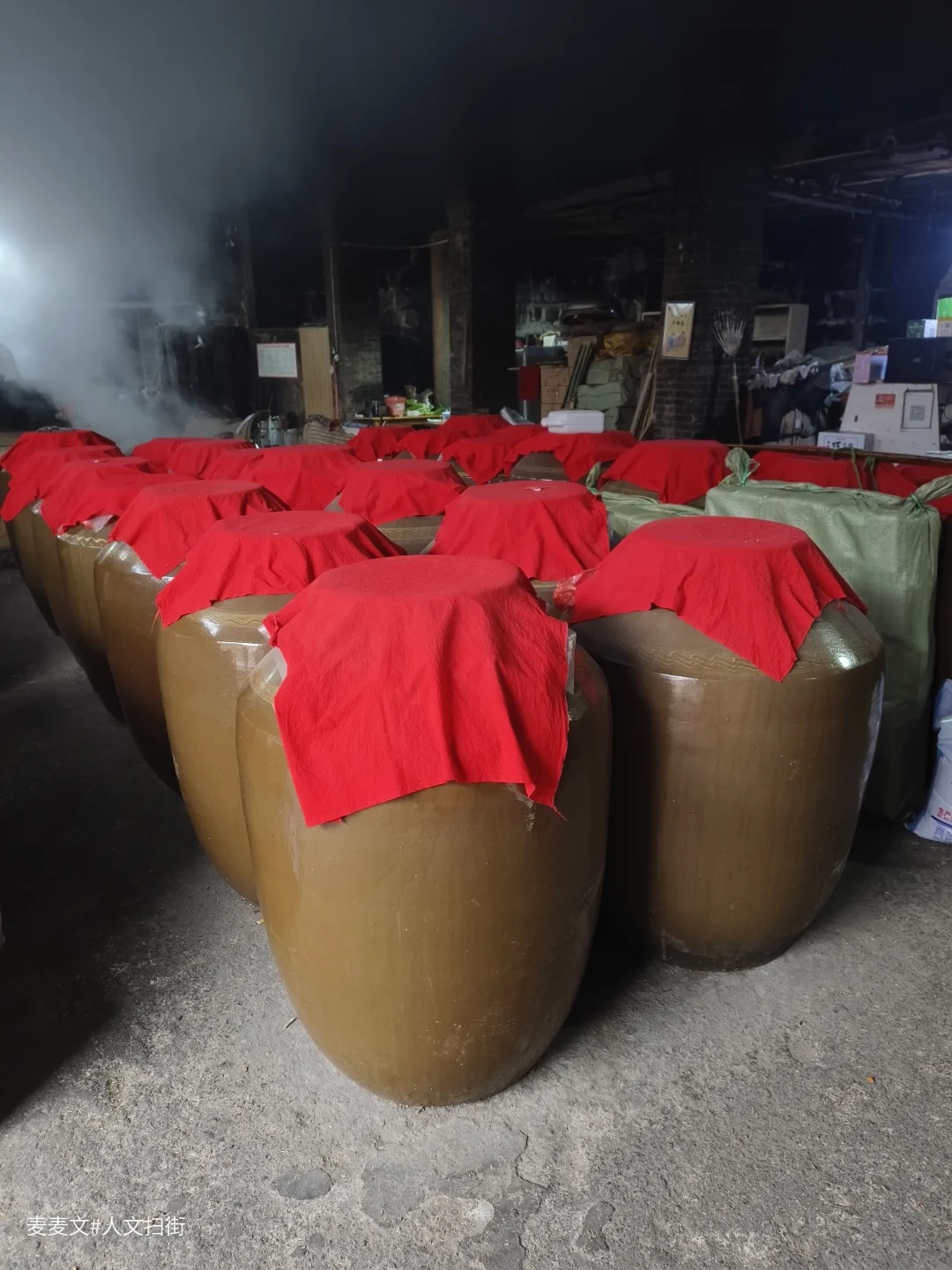 只见两个酿酒工人正挥汗如雨,加料捂盖,酒桶冒出缭绕蒸汽,升腾着向屋顶慢慢散去。酿酒池旁就是存酒窖,几十缸酿制好的白酒坛占据了博物馆的主要空间,这里四壁看上去有些斑驳,老物件四处摆放,车间内还有两块几十年的简阳县国营酒厂牌子,不动声色地迎接造访的酒客。这个现制现售的老作坊,就是一幅纯香老酒的制作图。