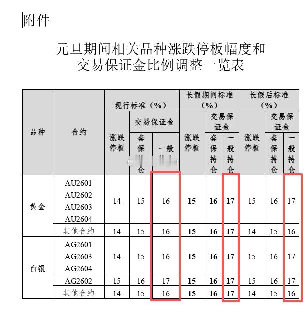上海期货交易所:2025年12月30日(星期二)收盘结算时起,交易保证金比例和涨跌停板幅度调整如下: 黄金、白银期货合约的涨跌停板幅度调整为15%,套保持仓交易保证金比例调整为16%,一般持仓交易保证金比例调整为17%; 白银AG2602合约的涨跌停板幅度仍为15%,套保持仓交易保证金比例仍为16%,一般持仓交易保证金比例仍为17%。 如遇《上海期货交易所风险控制管理办法》第十三条规定情况,则在上述交易保证金比例、涨跌停板幅度基础上调整。 三、2026年1月5日(星期一)交易后,自第一个未出现单边市的交易日收盘结算时,涨跌停板幅度和交易保证金比例调整如下: 黄金期货AU2601、AU2602、AU2603、AU2604合约,白银期货AG2601、AG2602、AG2603、AG2604合约维持涨跌停板幅度和交易保证金比例不变; 其他期货合约的涨跌停板幅度和交易保证金比例恢复至原有水平。