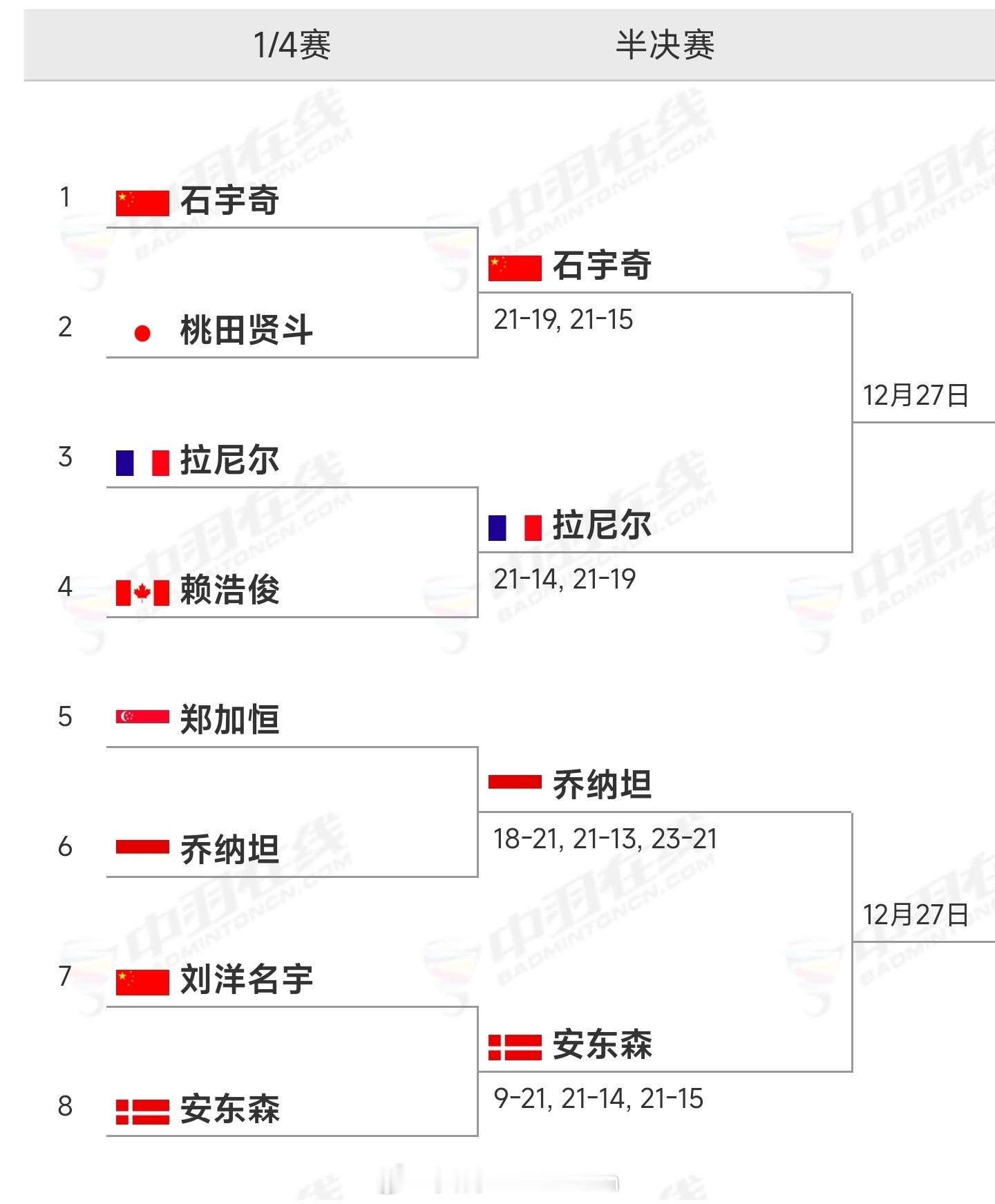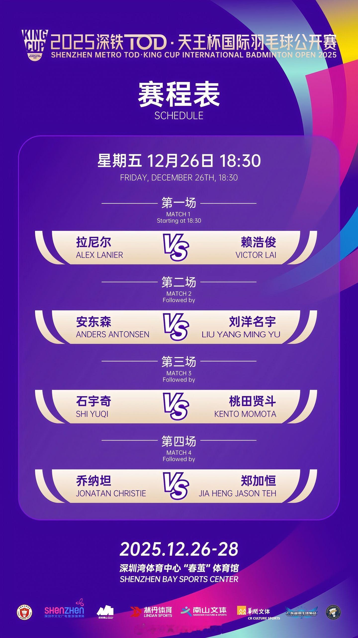 2025年天王杯今日比赛马上开始【18:30】❶拉尼尔🇫🇷 2:0 赖浩俊🇨🇦❷刘洋名宇🇨🇳 1:2 安东森🇩🇰❸石宇奇🇨🇳 2:0 桃田贤斗🇯🇵❹乔纳坦🇮🇩 2:1 郑加恒🇸🇬直播渠道:wx/dy搜索🔍天王杯均可找到2025年天王杯国际羽毛球公开赛天王杯石宇奇vs桃田贤斗
