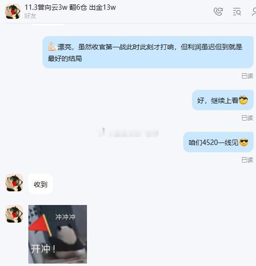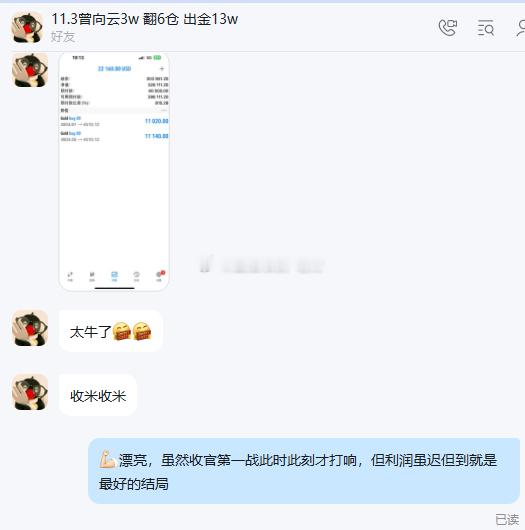 我来了,我来了,我带着利润走来了老方实盘喜讯分享 恭喜实盘小云进场便拿下近60点利润,成功打响我们2025年最后一个收官开门红,也许利润迟到,但绝不会缺席!!!别人上车两个小时,行情一动不动,我们上车行情直接开始拉升,看来我不仅是实战预言家,现在又多了一个身份,外汇市场的气运之子,兼华尔街之狼的精准。兄弟们不多说了,行情一路涨,我们就一路收割,一路爽,让我们2025的最后一个收官之战,在我们的大赚特赚下,圆满落幕黄金金价金油趋势实战大师-老方25年最后的收官之战,雄起