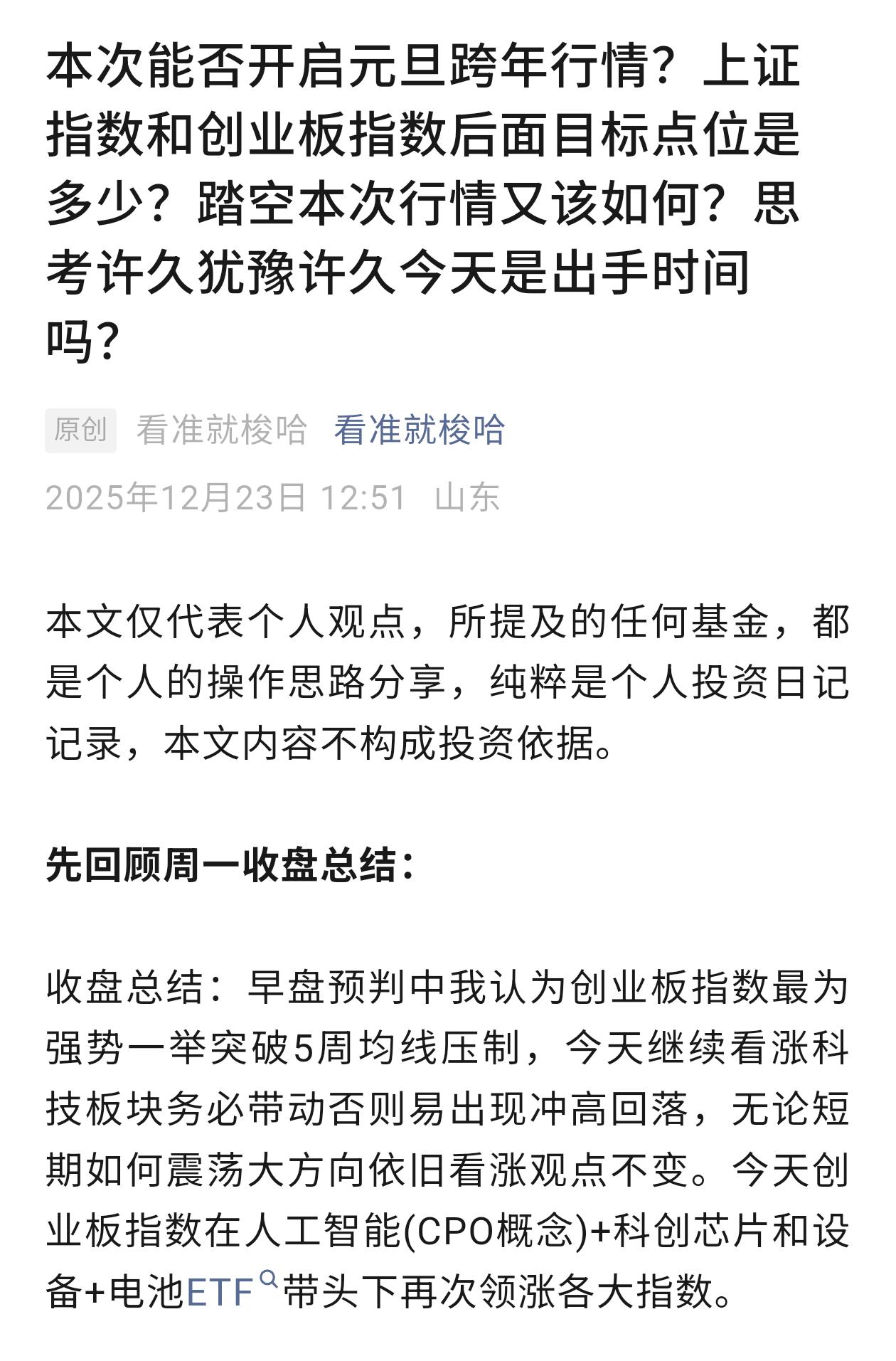 收盘总结:早盘预判中今天创业板指数看回踩,回踩下来是机会大于风险今天创业板指数高开低走回踩5日均线上方止跌企稳在电池ETF带动下再次往上突破。关于电池ETF我的观点昨天长篇文章讲的非常明白,本次行情从人工智能(CPO概念)到科创芯片和设备到电池ETF都在我们预判主线之中。 昨天长篇文章观点我认为板块是轮动后面大概率就是电池和机器人板块,电池布局不够依旧可以重点关注。(机器人还需要点耐心一季度不会辜负我们的) 本次能否开启元旦跨年行情?上证指数和创业板指数后面目标点位是多少?踏空本次行情又该如何?(长篇文章再次更新) A股年成交额破400万亿你怎么看 为什么要强调按新一轮行情去思考