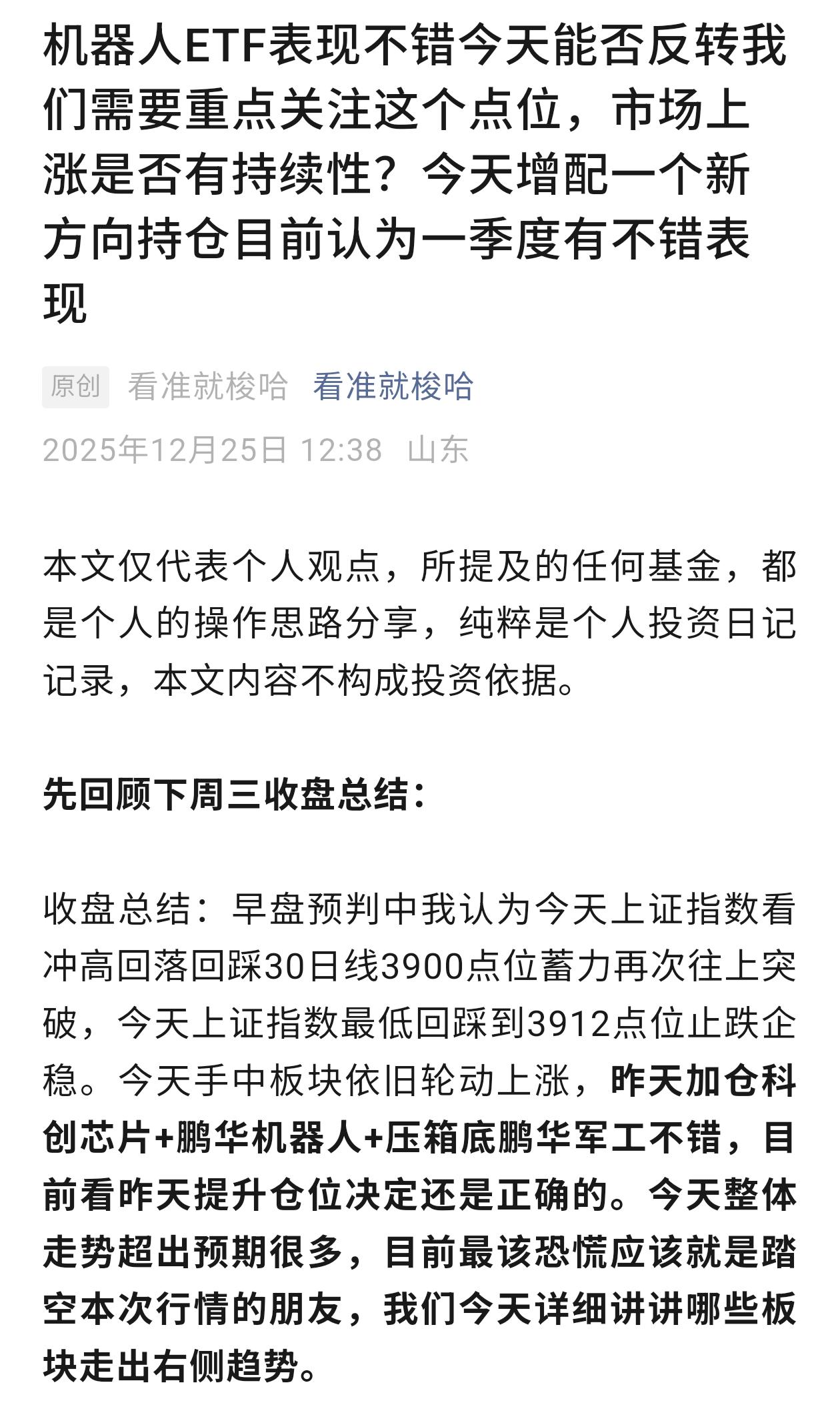 收盘总结:早盘预判中我认为指数今天看震荡,手中板块看轮动上涨。今天走势符合预判指数一上午都在震荡,今天机器人板块和军工板块领涨。关于鹏华军工我一直观点认为12月会冲一波主升浪,只有行情走出来才能验证预判含金量。(图二) 周二趋势走出来多次提示我们需要提升仓位增配机器人和科创芯片,今天鹏华机器人大涨4.77%符合预期。(昨天还要建议低于7层仓位加仓机器人板块) 今天长篇文章再次更新增配一个新方向,一季度看好的方向。详细讲讲机器人ETF能否反转? A股成交额突破历史意味着什么 新手小白:指数基金跟股票一样吗