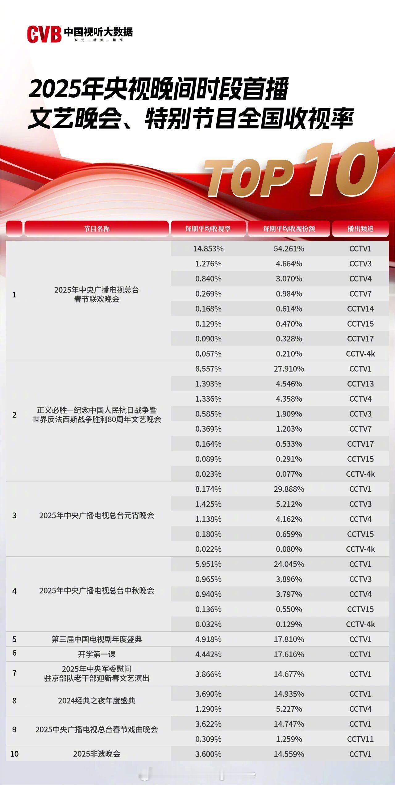 【CVB中国视听大数据年榜】2025年省级卫视/央视晚间时段首播文艺晚会、特别节目全国收视率TOP20辽视春晚、北京卫视春晚、湖南卫视春晚、天津相声春晚、东方卫视春晚、湖南卫视中秋之夜、湖南卫视元宵喜乐会、电视剧品质盛典、芒果转播央视春晚、山东卫视春晚、正义必胜、北京国际电影节闭幕式暨颁奖典礼、上海国际电影电视节、白玉兰颁奖典礼、欢剧喜乐会、蛮好的人生开播特别节目、618开心夜、湖南旅游发展大会、东方卫视中秋晚会、双11疯狂好六夜、番茄转播央视春晚