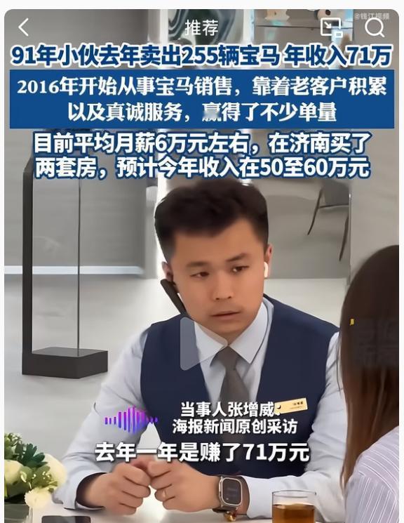 看了宝马销冠张增威推行一口价的视频,我懂了为什么他敢这么做,不是他冒进,而是真有底气。 他试行一口价8天卖了11台,说和顾客来回谈价太累,顾客也烦,就学特斯拉模式统一价格,结果效果还不错。 他从2016年干宝马销售,靠真诚服务和拼劲,去年卖了255台,收入70多万,说自己不为钱,就想通过卖车实现自我价值,让顾客省心。 这样的销售,谁会觉得他的一口价不是真心想让顾客少受累呢?
