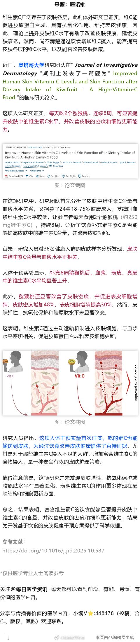 健闻登顶计划 人体研究证实:每天2个猕猴桃,可提升皮肤维C水平,并改善皮肤功能近日,奥塔哥大学研究团队在" Journal of Investigative Dermatology "期刊上发表了一篇题为" Improved Human Skin Vitamin C Levels and Skin Function after Dietary Intake of Kiwifruit:A High-Vitamin-C Food "的临床研究论文。这项人体研究证实,每天吃2个猕猴桃,连续8周,可显著提升皮肤中的维生素C水平,并改善皮肤的密度和细胞更新能力。