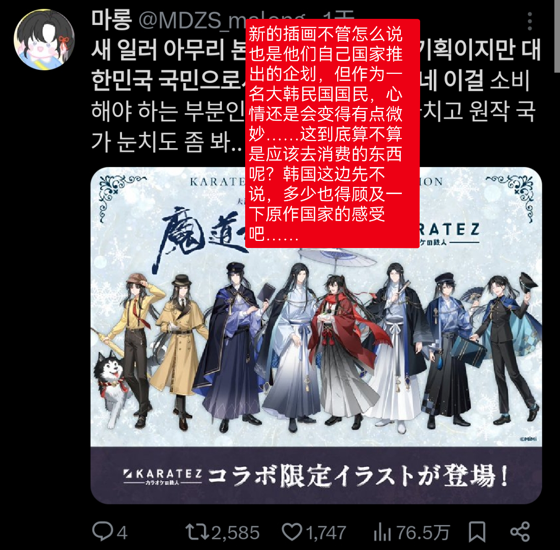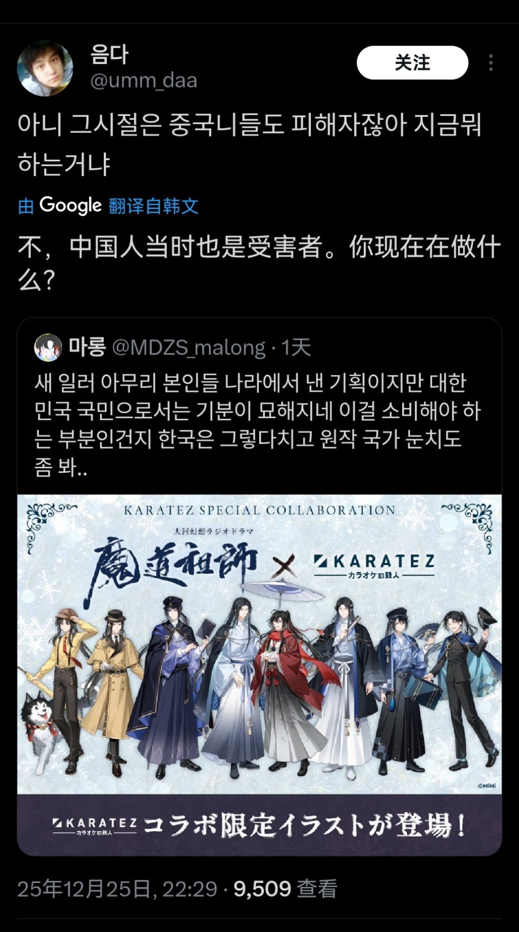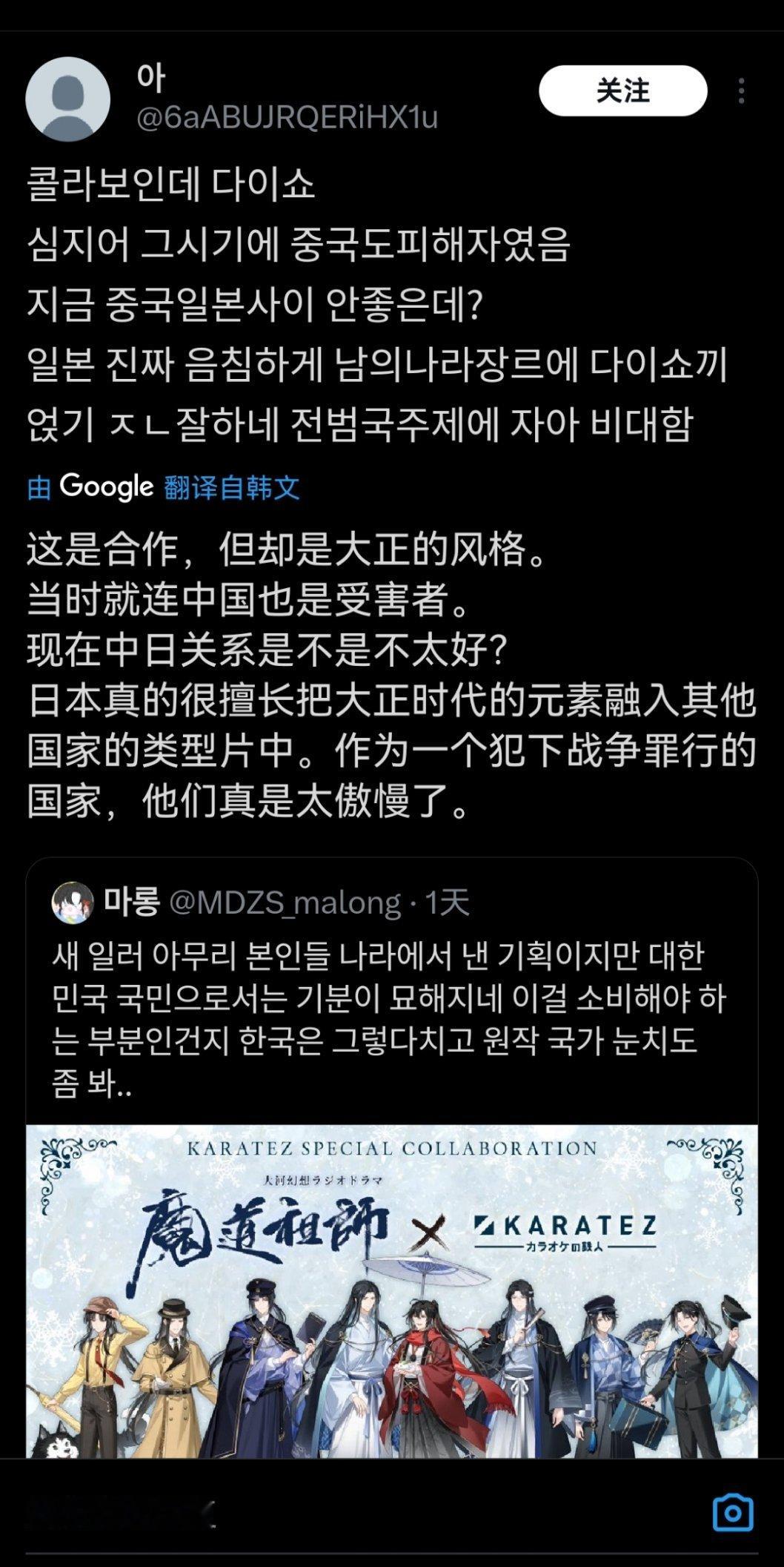 日本方面联动魔道祖师广播剧时,推出了角色的“大正风格插图”。推特上有韩国人质疑日本大正时期(1912年—1926年)也是日本对中韩侵略加剧时期,日方参加一战后趁机出兵占领了中国胶东,并提出了灭亡中国的21条,日方这样做是不是不顾及中国人民的感情?(这张插画的插画师据称来自中国台湾省……)