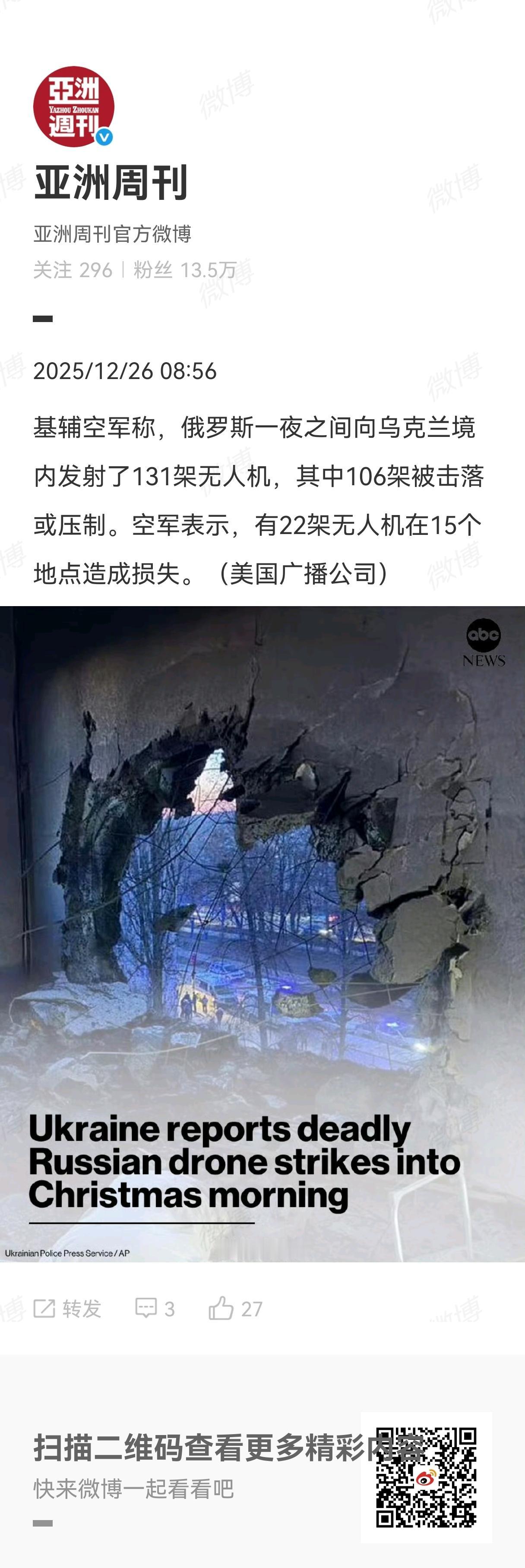 据美国广播公司报道,基辅空军称,俄罗斯12月23日向乌克兰境内发射了131架无人机,其中106架被击落或压制。空军表示,有22架无人机在15个地点造成损失。这次的战略叫做无人机饱和攻击消耗乌防空弹药,配合导弹打击关键能源节点,同步实施电子战与网络攻击(如DDOS)。这应该是未来战争的常态,拼的是工业制造能力,拼的是工业链的供应能力,拼的是整个工业成品的运输能力。这也是今后普通人就业的主要方向。