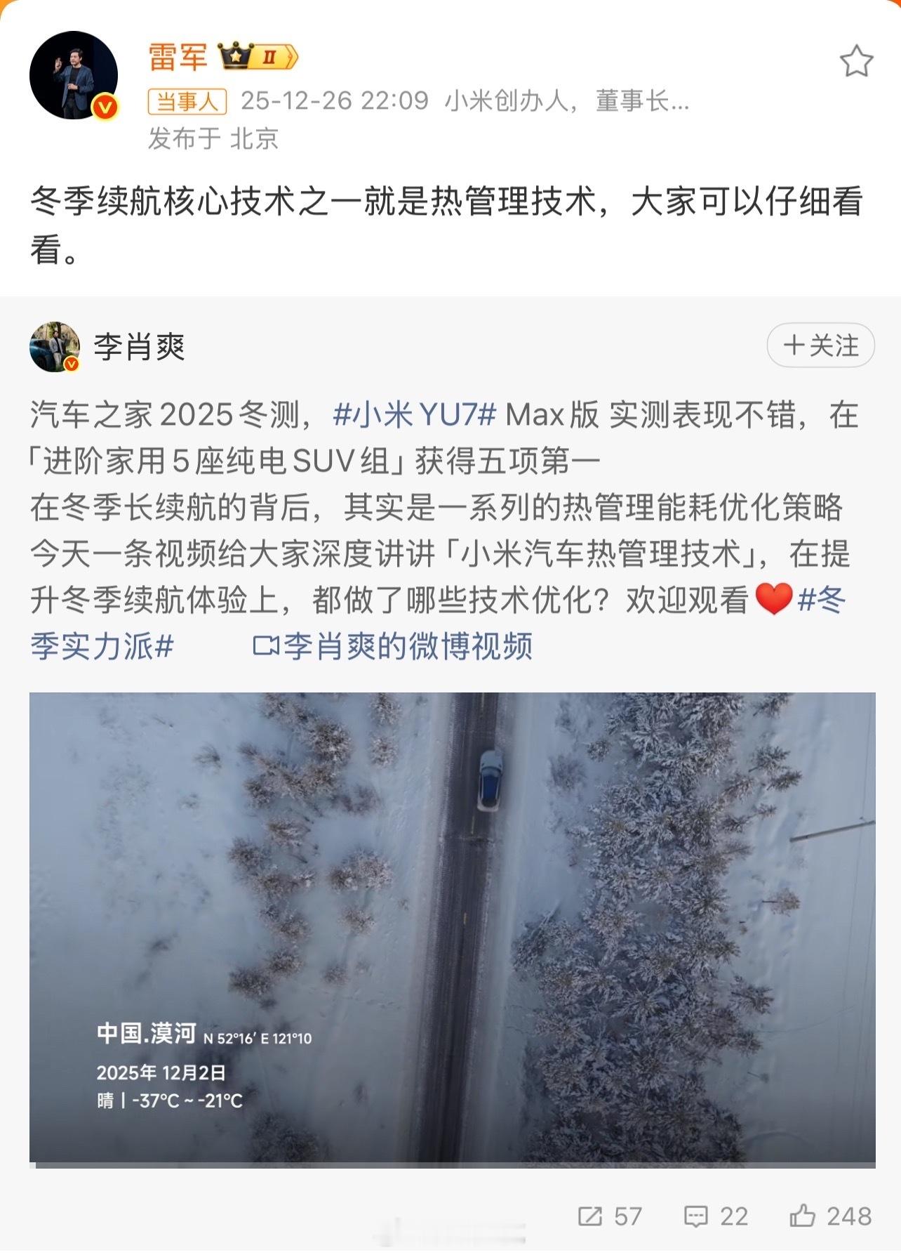 小米YU7冬季实测五项第一在零下二十多度的黑龙江黑河,小米YU7跑出了319公里的实测续航,续航达成率有42.5%。充电速度也很顶。这下北方用户不用担心电车怕过冬的问题了雷军回应小米YU7冬测成绩